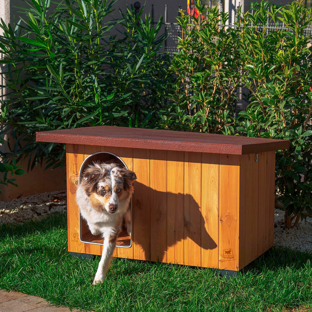 Ideale per il vostro giardino! Baita è una cuccia per cani realizzata in legno di pino nordico certificato FSC™ , proveniente cioè da foreste gestite in maniera corretta e responsabile secondo rigorosi standard ambientali, sociali ed economici e altre fonti controllate. Le tavole sono assemblate con cura al fine di evitare fessure e passaggi d'aria e garantire così protezione totale.