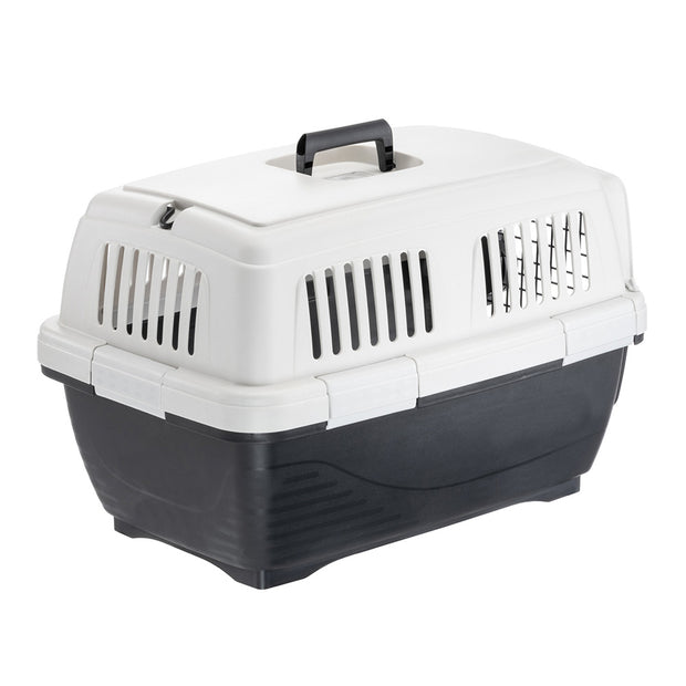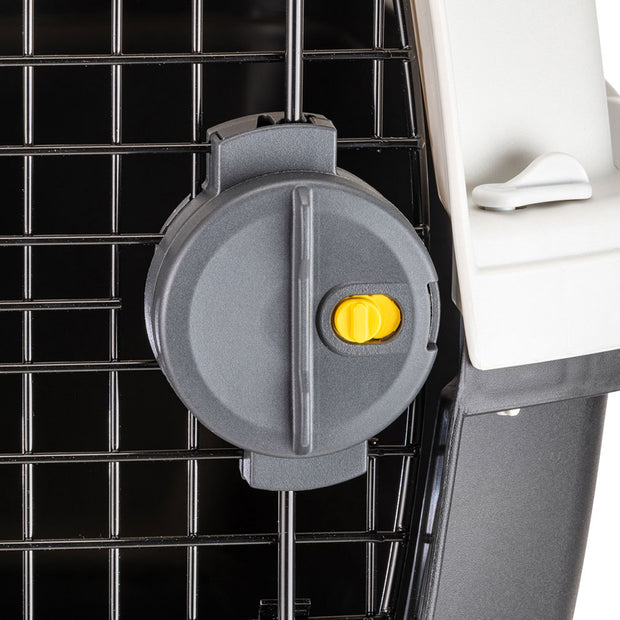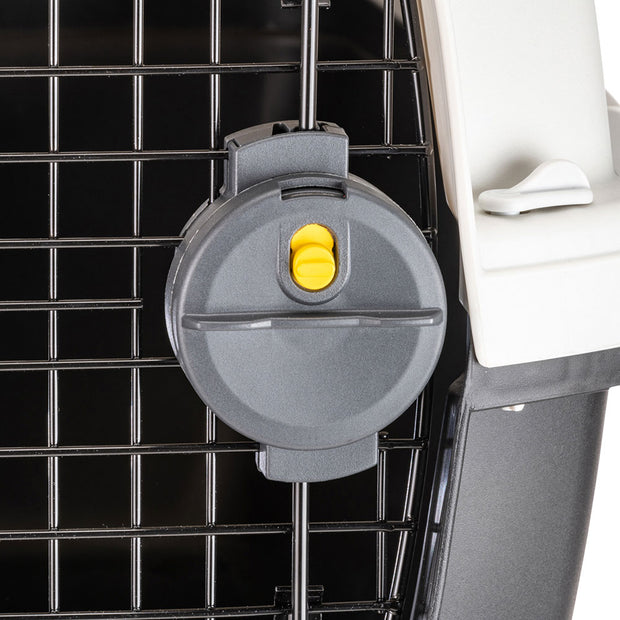 Solidi e robusti, sono costruiti in resina termoplastica e dotati di porta in ferro plastificato con maglia di 19 x 19 mm per maggiore sicurezza. I trasportini Clipper sono dotati di una serratura a 2 vie, estremamente affidabile, che evita spiacevoli aperture accidentali durante il viaggio. Ruotando la manopola, vengono infatti attivati due punti di fissaggio che ancorano l'anta alla struttura principale del trasportino.