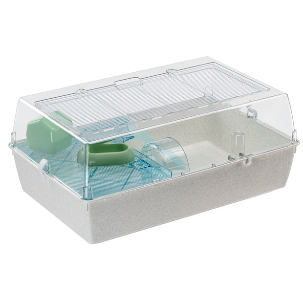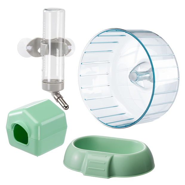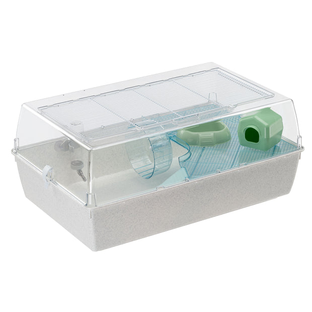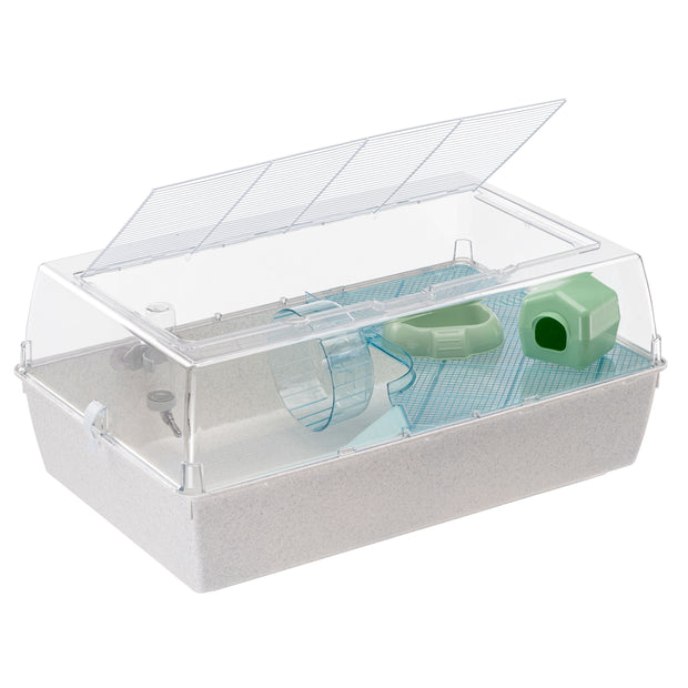 Il vostro criceto o topolino troverà un ambiente completo di accessori: una ruota per l'esercizio, essenziale per la salute fisica del piccolo amico, una casetta nido per garantire un riparo privato e confortevole, una ciotola per il cibo e un beverino, entrambi facili da posizionare grazie ai sistemi di aggancio di cui sono provvisti. Completano la dotazione un ampio ripiano e una comosa scaletta in plastica.