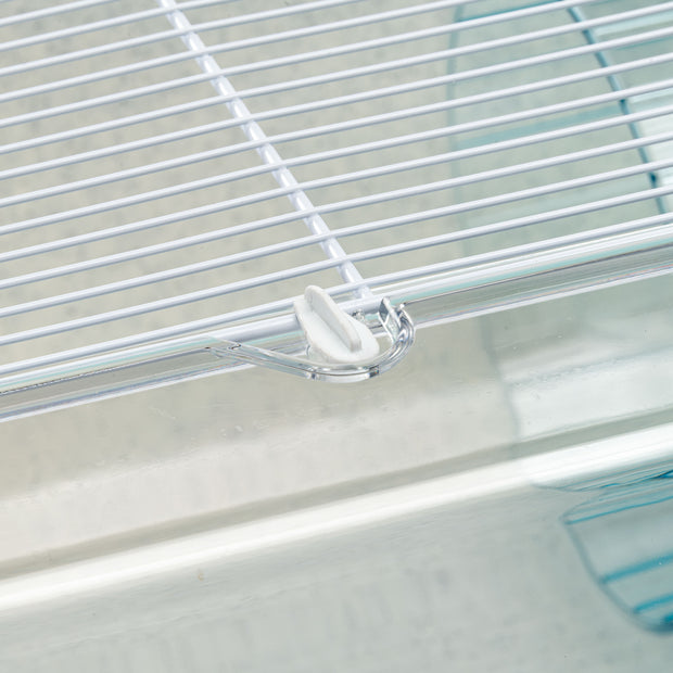 Il coperchio in plastica trasparente è dotato di un tetto con griglia in rete metallica verniciata, che assicura una ventilazione ottimale pur permettendo una visuale chiara dell'interno. Questa griglia può essere facilmente sollevata e bloccata con gancetti ruotabili, garantendo un accesso sicuro e semplice all'interno della gabbia.