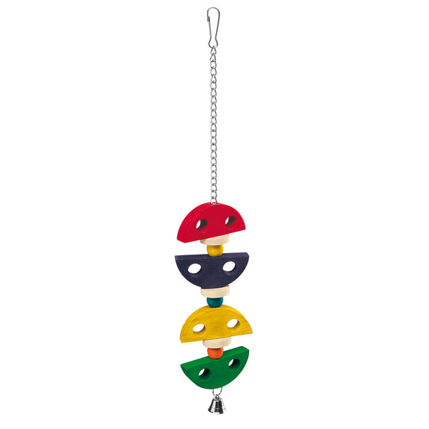 PA 4095 è un gioco pendente in legno per pappagalli e cacatua, parte di una linea di passatempi a loro dedicata. L'ideale per procurare momenti di gioia ai nostri amici pennuti! Molto colorati e con forme fantasiose, questi giochi sono tutti dotati di uno o più campanellini e di una catena in metallo con gancio per consentire un pratico fissaggio alla gabbia. Concentrati sul totale benessere delle vostre bestiole, le vernici impiegate per colorare il legno sono completamente atossiche.