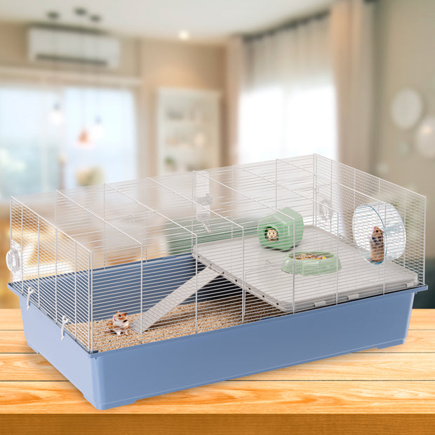 La struttura è realizzata con una rete metallica a passo stretto che garantisce una maggiore sicurezza per l'animale, prevenendo fughe e garantendo una ventilazione adeguata senza compromettere la visibilità. Questa caratteristica è essenziale per mantenere un controllo costante sul benessere del vostro criceto o topolino, offrendo al contempo un habitat sicuro e confortevole.
