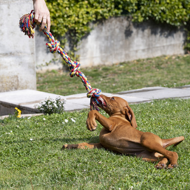PA 6524 è un'ottima alternativa ai classici giochi in gomma e lattice: questo gioco dentale per cani, infatti, è formato da una corda in cotone intrecciato e annodato in più punti, al centro e alle estremità. Indicato per fare divertire e allenare il vostro amico a quattro zampe con attività come il riporto e il \tira e molla\, aiuta l'animale a tenere esercitati i muscoli della bocca e massaggia le gengive. PA 6524 è assolutamente sicuro per la salute del cane, infatti è realizzato solo con l'impiego di materiali controllati e di alta qualità. Per prevenire qualsiasi inconveniente dovuto alla rottura del gioco, è opportuno controllarne abitualmente lo stato d'usura, sostituendolo quando è troppo consumato.
