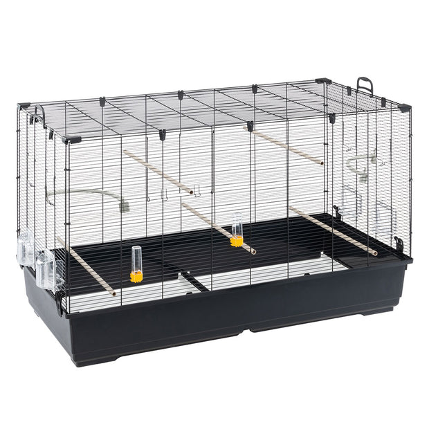 Spaziose e confortevoli, le gabbie per uccelli Piano 7 e Piano 8 sono ideali per ospitare canarini, cocorite e altri uccellini. Caratterizzate da un design pulito ed essenziale, hanno una struttura in rete di metallo verniciato con tetto dotato di supporti angolari e clip di fissaggio a garanzia di massima solidità e sicurezza. Comode maniglie applicate sul tetto consentono facili spostamenti. Gli habitat sono dotati inoltre di capiente fondo in plastica con cassetti estraibili per facile e veloce pulizia. Accessori inclusi: posatoi tradizionali, posatoi angolari e beverini, oltre alle speciali mangiatoie estraibili Brava 2. Queste pratiche mangiatoie sono state progettate in modo da poter essere girate di 180° e riempite dall’esterno, senza lasciare alcuna apertura da cui l'uccellino possa scappare. Realizzate in robusta plastica trasparente, hanno utili bordi che impediscono al cibo di cadere al di fuori della gabbia.