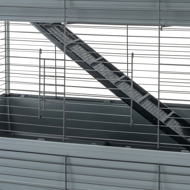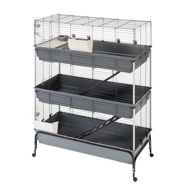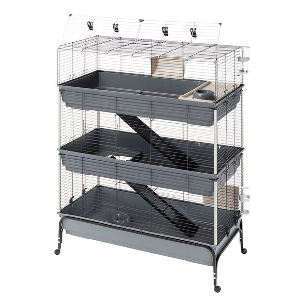 Con Rabbit 120 Tris i vostri simpatici conigli avranno ben tre piani tutti per loro! L'habitat, adatto ad ospitare anche più animali, si caratterizza per gli spazi davvero ampi studiati per il massimo comfort. La struttura in rete metallica è trattata con una speciale vernice anticorrosione a garanzia di massima resistenza e durata, completata da colonnine laterali in plastica a garanzia di maggiore stabilità. I tre capienti fondi in resina termoplastica contengono efficacemente sporco, residui di cibo ed escrementi, evitando che possano fuoriuscire all'esterno. La gabbia è corredata di accessori quali mangiatoie per il fieno, beverini, ciotole e casetta per i momenti di relax, che potrete posizionare a piacimento secondo le vostre esigenze. Due comode scalette in legno consentono all'animale di accedere facilmente ai vari piani.
