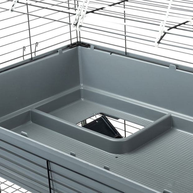 - La rete frontale della gabbia superiore è completamente sollevabile, dotata di clip di chiusura progettate per maggiore sicurezza dell'animale