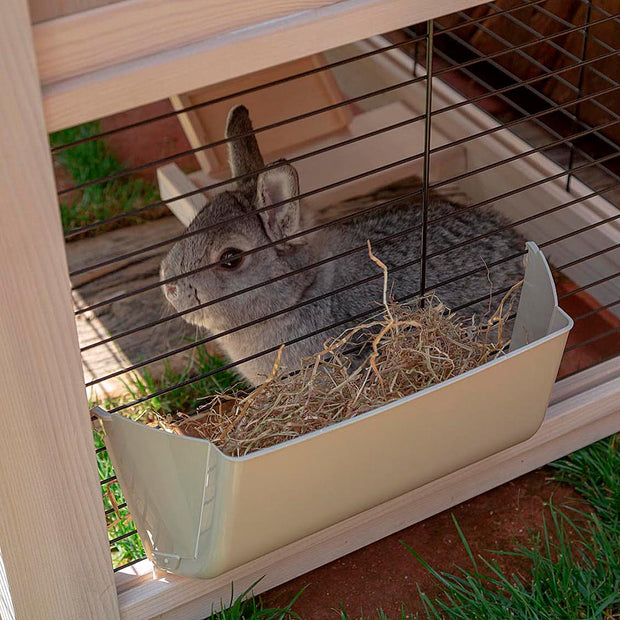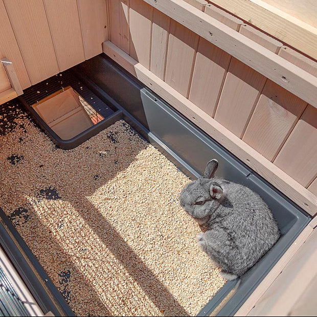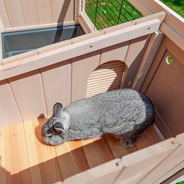 La conigliera è dotata di grande cassetto centrale estraibile, perfetto per raccogliere sporco, residui di cibo o lettiera, nascosto da uno sportello ribaltabile in legno bloccabile tramite appositi gancetti e di tetto completamente apribile con braccio di supporto.L'apertura che dà accesso al piano inferiore, inoltre, è dotata di coperchio di chiusura, molto pratico durante le operazioni di pulizia, e di bordo rialzato per evitare che la lettiera possa cadere di sotto.