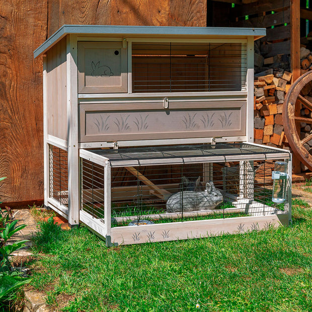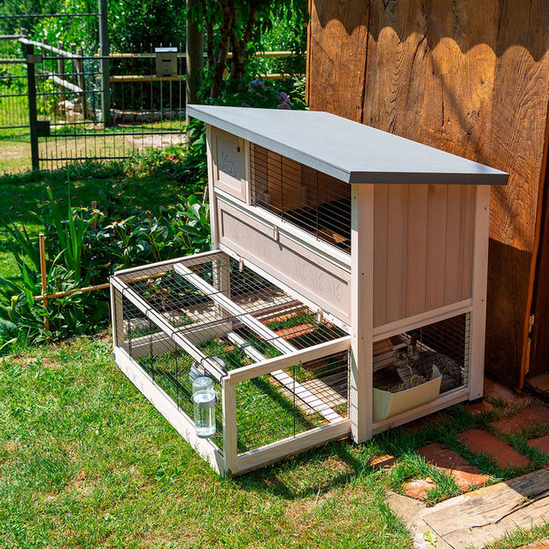 La conigliera Ranch 120 Max è particolarmente ampia e suddivisa su diversi ambienti, pensata per soddisfare tutte le esigenze del roditore e garantirgli massimo comfort in qualsiasi momento della giornata. Al piano terra, ad esempio, ideale per le attività diurne, troverete un recinto delimitato da una rete in metallo a scorrimento che consente di raddoppiare lo spazio e il comfort abitativo a disposizione del simpatico roditore. Il recinto è provvisto di porta scorrevole con gancio di chiusura di sicurezza, completamente accessoriato con mangiatoia in plastica, beverino, ciotola per il cibo e scaletta per accedere al piano superiore, dedicato invece alle attività notturne o agli eventuali riposini durante il giorno. Questa zona più tranquilla è fornita di capiente fondo in plastica ideale per contenere la lettiera e di rampa in legno che dà accesso ad una comoda casetta per il coniglio. La casetta ha uno sportello frontale apribile ed è anch'essa dotata di chiusura di sicurezza.