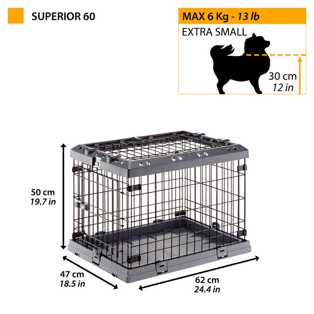 I box Superior sono dotati di ampie aperture per una maggiore flessibilità d'uso sia in casa che in viaggio. Il modello piccolo Superior 60 presenta 2 aperture, una laterale e una superiore, i modelli grandi invece ne hanno 3, una laterale, una superiore e una frontale. Il tetto, inoltre, è completamente apribile e removibile, comodo perché consente di accarezzare il cane. Le porte, rinforzate con una doppia serratura di sicurezza, sono ampie e consentono un accesso agevole al vostro amico.