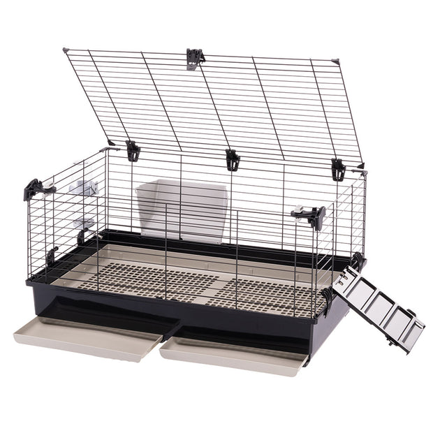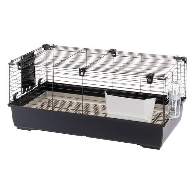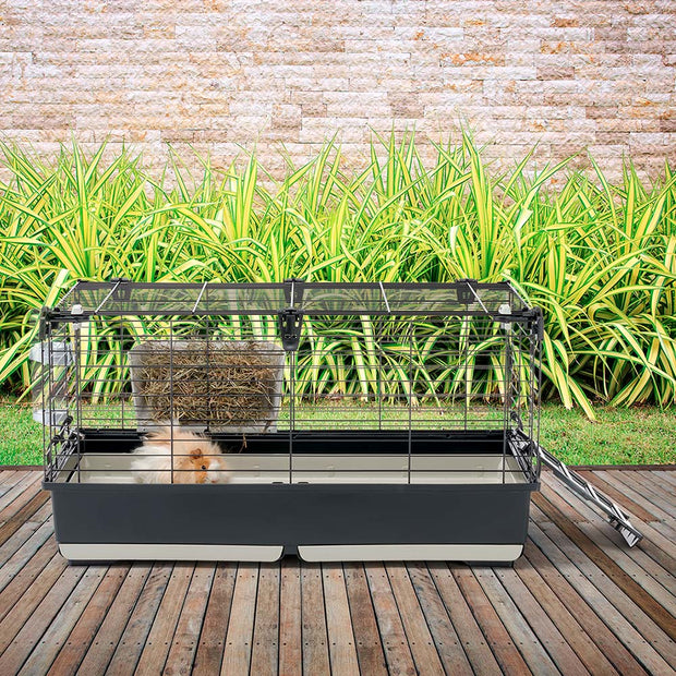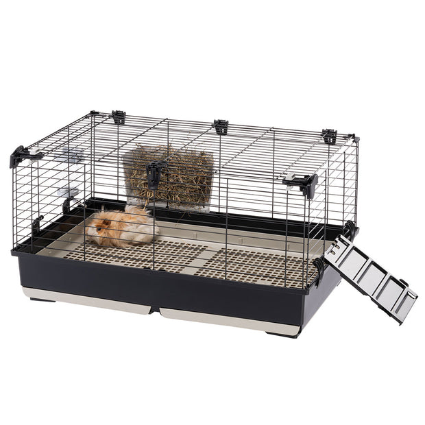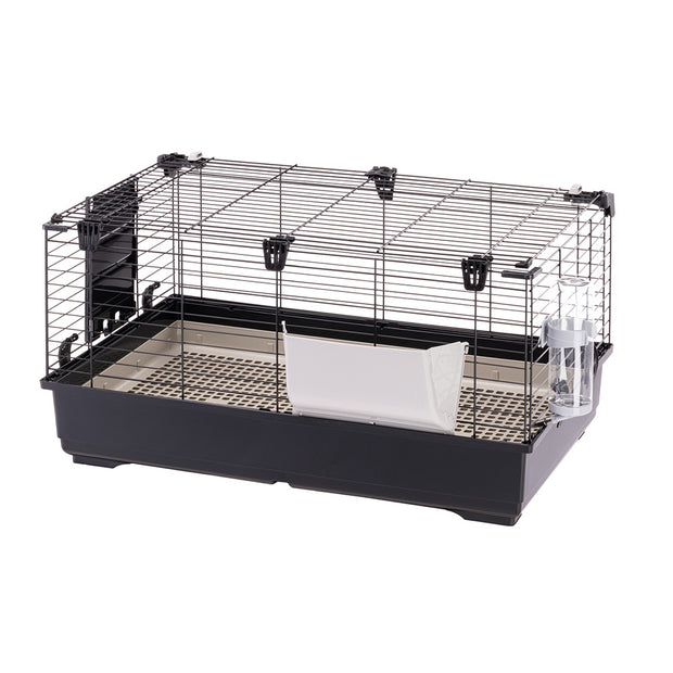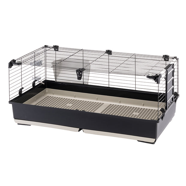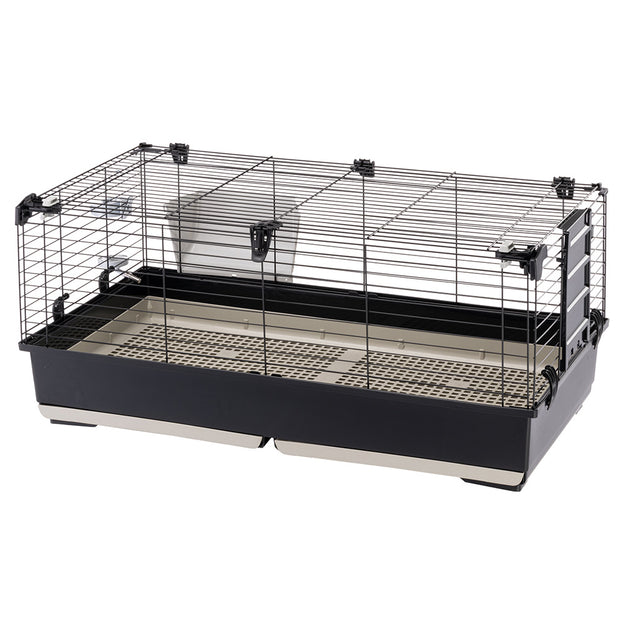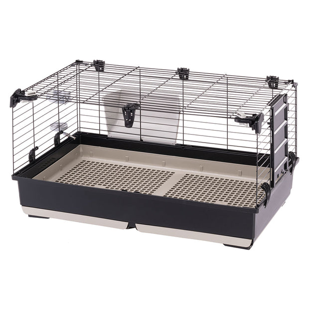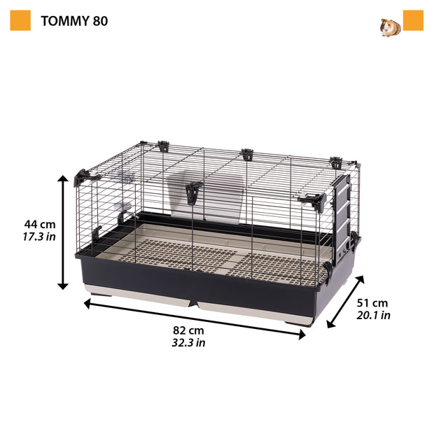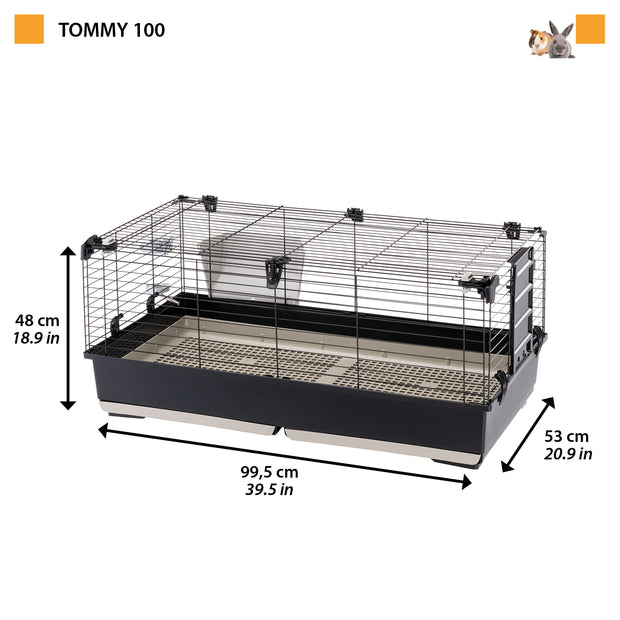 Tommy è una gabbia per conigli robusta e solida, costruita con materiali di qualità a garanzia di comfort, sicurezza e praticità di gestione. L'habitat, adatto ad ospitare anche porcellini d'India, presenta una struttura in rete di metallo verniciato con tetto apribile dotato di clip di fissaggio per massima sicurezza. E' dotato di capiente base in plastica con cassetti estraibili per una manutenzione veloce. Inoltre, posta sul fondo, una griglia in plastica assicurerà igiene e pulizia evitando che l'animale possa venire in contatto con urina, escrementi o sporco mantenendo perciò le proprie zampe pulite e asciutte.