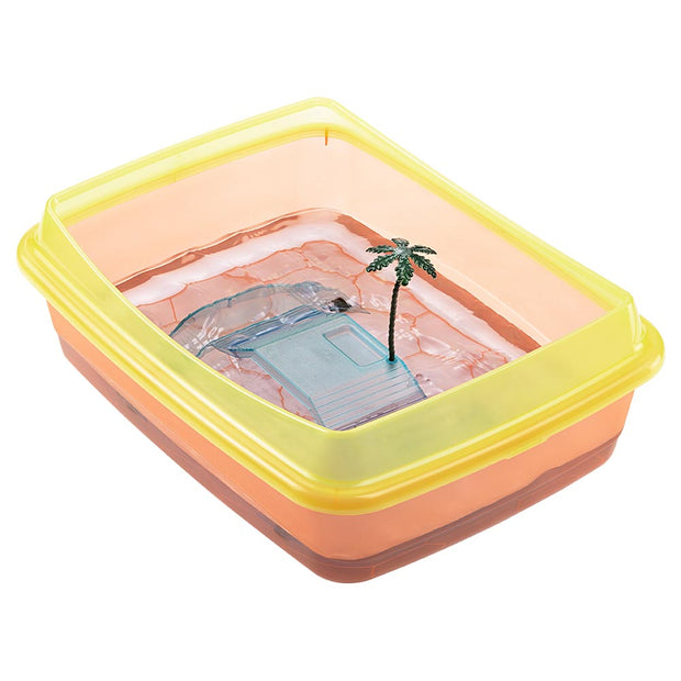 Tortugas è una simpatica tartarughiera in plastica colorata composta da un fondo capiente e da una pratica cornice removibile per la pulizia. Questa vasca per tartarughe viene venduta completa di isola con ventose e piccola palma; l'isola si fissa saldamente sul fondo, è dotata di piccoli gradini e piano di appoggio. Grazie al suo particolare fondo contenitivo, Tortugas evita inoltre la fuoriuscita di schizzi d'acqua ed è perfetta per ospitare assieme piccoli rettili.