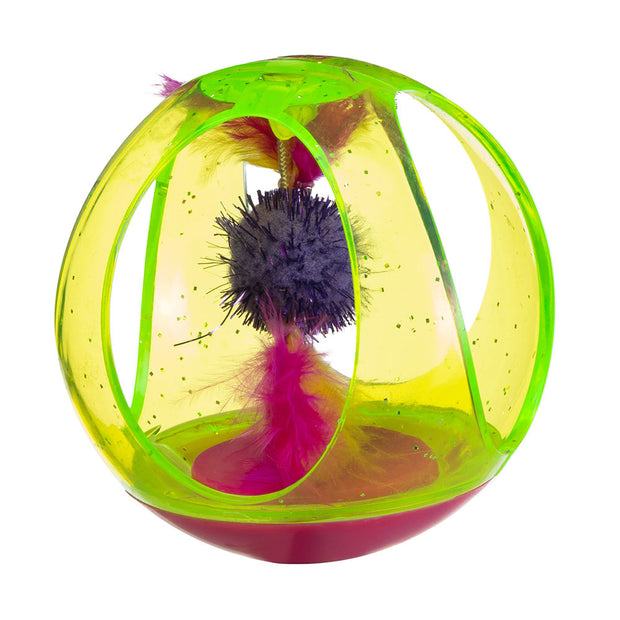 PA 5214 è un gioco per gatti a forma di palla con un animaletto in peluche all'interno. Costruita in resistente plastica trasparente, questa palla-gioco presenta aperture nei lati, che consentono la visione del topolino, incuriosendo ancor di più il gatto, il quale non vedrà l'ora di catturarlo. Essendo realizzata con materiali di qualità che non nuociono agli animali, il vostro micio potrà divertirsi a rincorrere questa palla in tutta sicurezza.