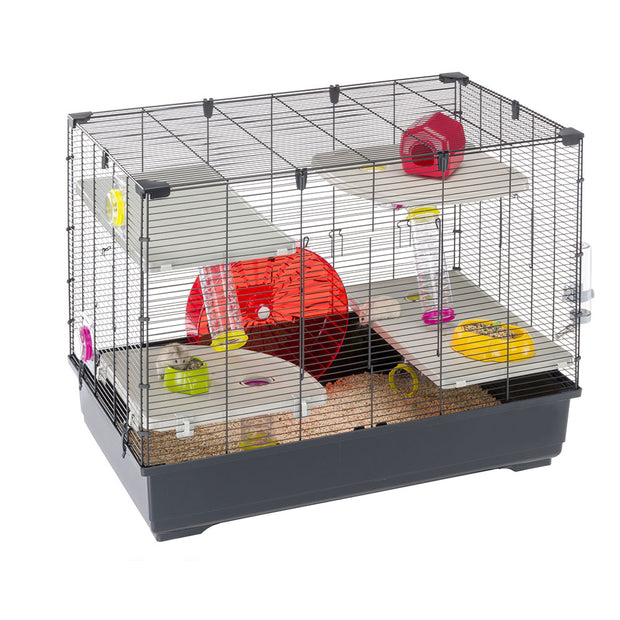 La gabbia per criceti Village 80 offre più piani studiati per incentivare gioco e movimento, assicurando al contempo massimo comfort abitativo all'animale. L'habitat è suddiviso su diversi livelli ottenuti tramite pianetti collegati da tunnel in plastica trasparente. Le diverse zone sono pensate per qualsiasi momento della giornata. Il roditore potrà mangiare, bere, riposare o giocare grazie agli indispensabili accessori inclusi: mangiatoia, ciotola, beverino, nido e grande ruota per criceti.