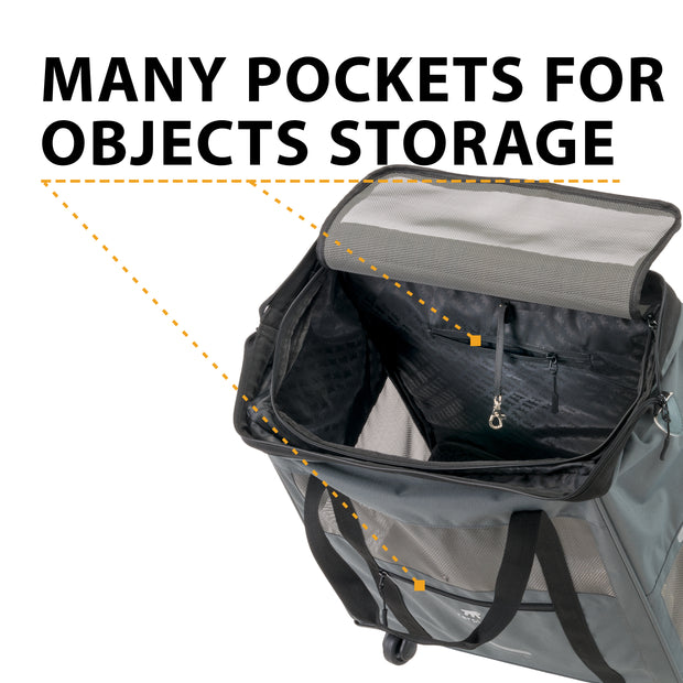 Trolley trasportino per cane e gatto, resistente, antigraffio e impermeabile, con manico telescopico, ruote removibili, tracolla regolabile e cinghietta di sicurezza. Dotato di ampie tasche multiuso e targhetta porta-nome integrata.