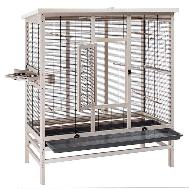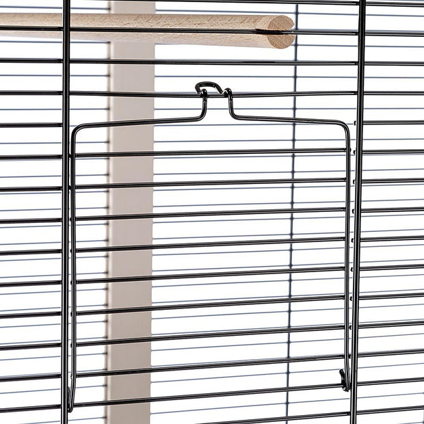 Completa di indispensabili accessori quali posatoi e ciotole in acciaio, robuste e igieniche, removibili dalla base. Il portaciotole, dotato di posatoio per gli uccellini, è girevole per rendere più facili le operazioni di riempimento e manutenzione.