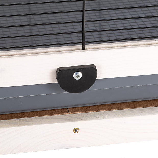 La voliera presenta un ampio sportello frontale apribile, dotato di gancio di sicurezza, e alcuni sportellini laterali, utili per le operazioni di manutenzione quotidiana.