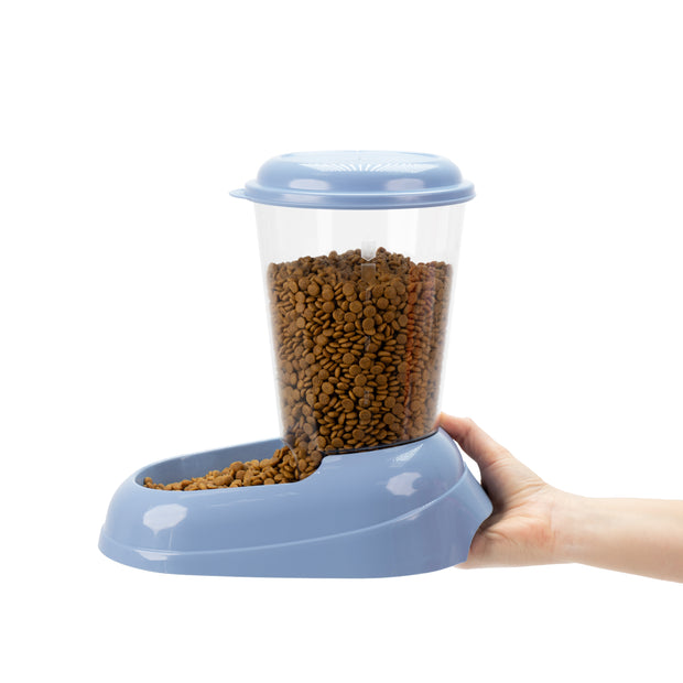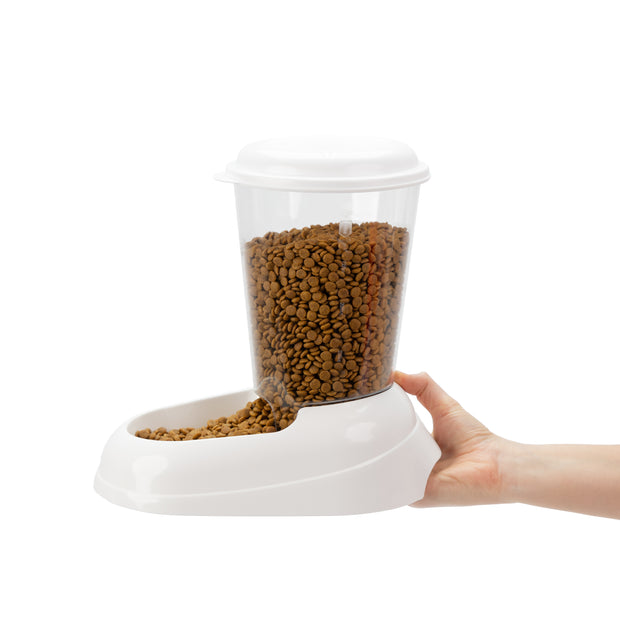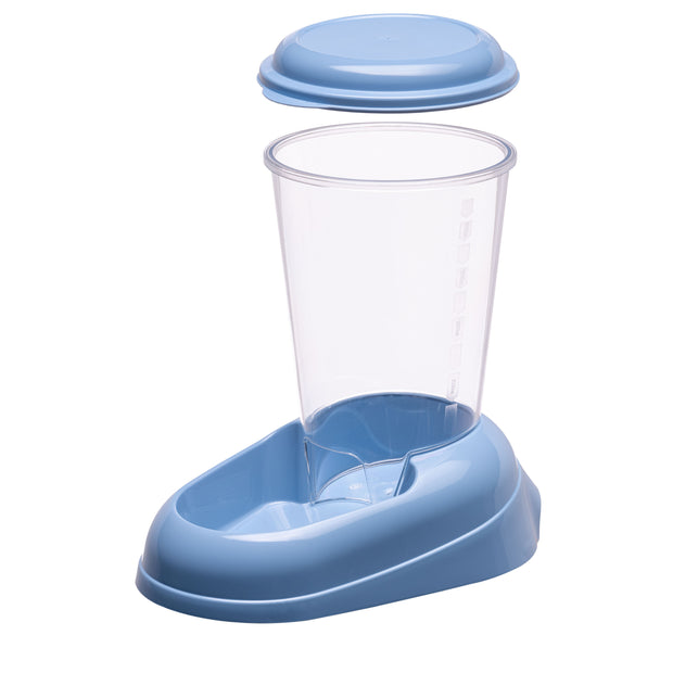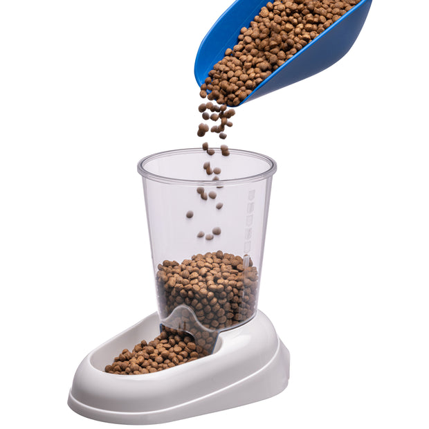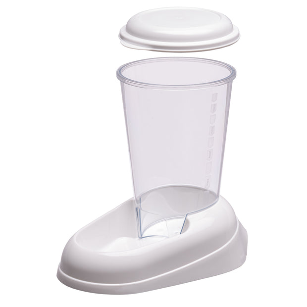 Grazie al distributore di cibo per cani e gatti Zenith, il vostro fedele amico potrà gustare in qualsiasi momento le sue crocchette preferite. Realizzato totalmente in plastica, il dispenser ha un serbatoio trasparente che permette di tenere sempre sotto controllo il livello di cibo contenuto al suo interno. Zenith è ideale sia per gatti sia per cani di piccola e media taglia, contiene fino a 3 litri di cibo secco ed è dotato di pratica impugnatura e di tappi in gomma antiscivolo. Il cibo secco inserito all'interno viene razionato progressivamente cadendo nella ciotola esterna, man mano che l’animale lo consuma.