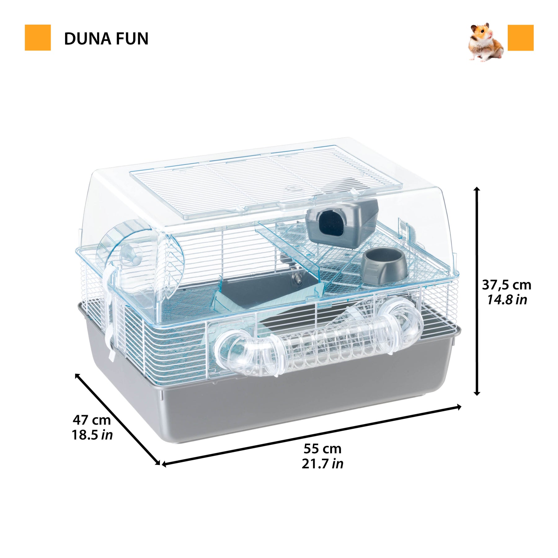 Molto simile nella costruzione a Duna Fun Large ma di dimensioni ridotte, Duna Fun è una gabbia per criceti suddivisa in tre piani collegati da comode scalette e corredati di tutti i comfort: all'interno troverete una casetta nido per roditori, beverino, ruota e tubi trasparenti, indispensabili accessori per fare divertire il vostro piccolo amico.