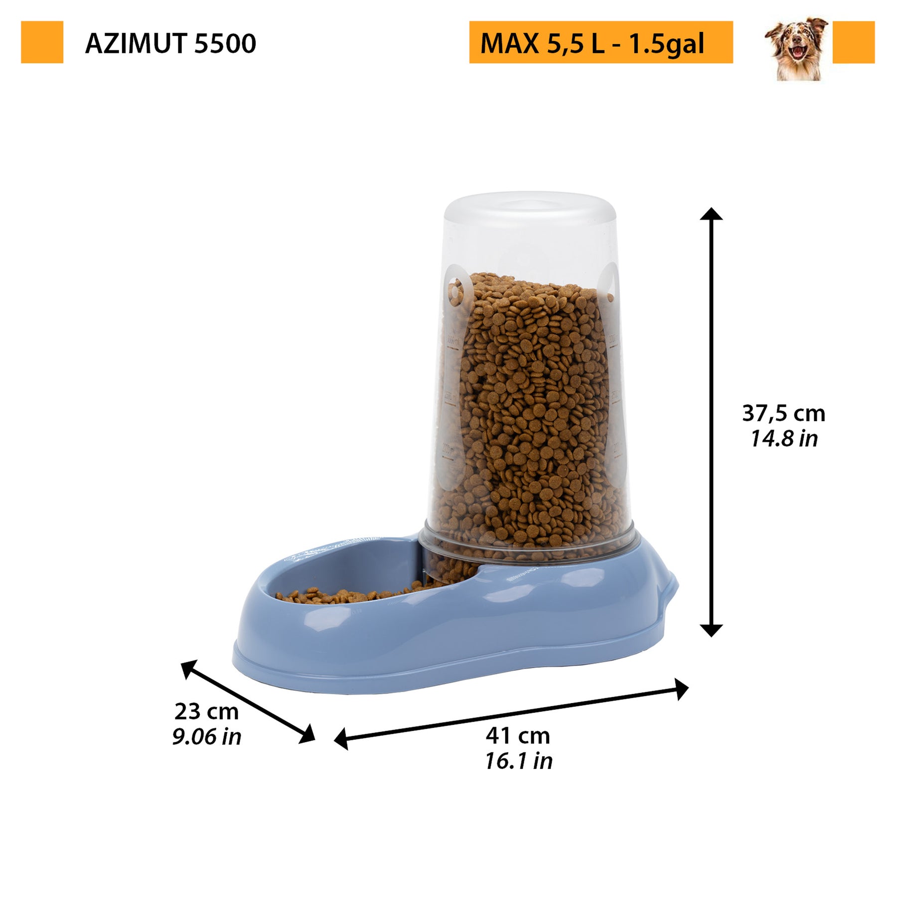 Azimut 5500 è un pratico distributore d'acqua o cibo per cani di grossa taglia. Versatile, ha sul serbatoio due diversi fori d'uscita che consentono l'utilizzo sia con acqua che con crocchette; il serbatoio, trasparente, ha una capacità di 5.5 litri ed è dotato di un utile indicatore di capacità. Realizzato in plastica con bordo in gomma antiscivolo, il dispenser è facile da maneggiare grazie alla presa ergonomica.