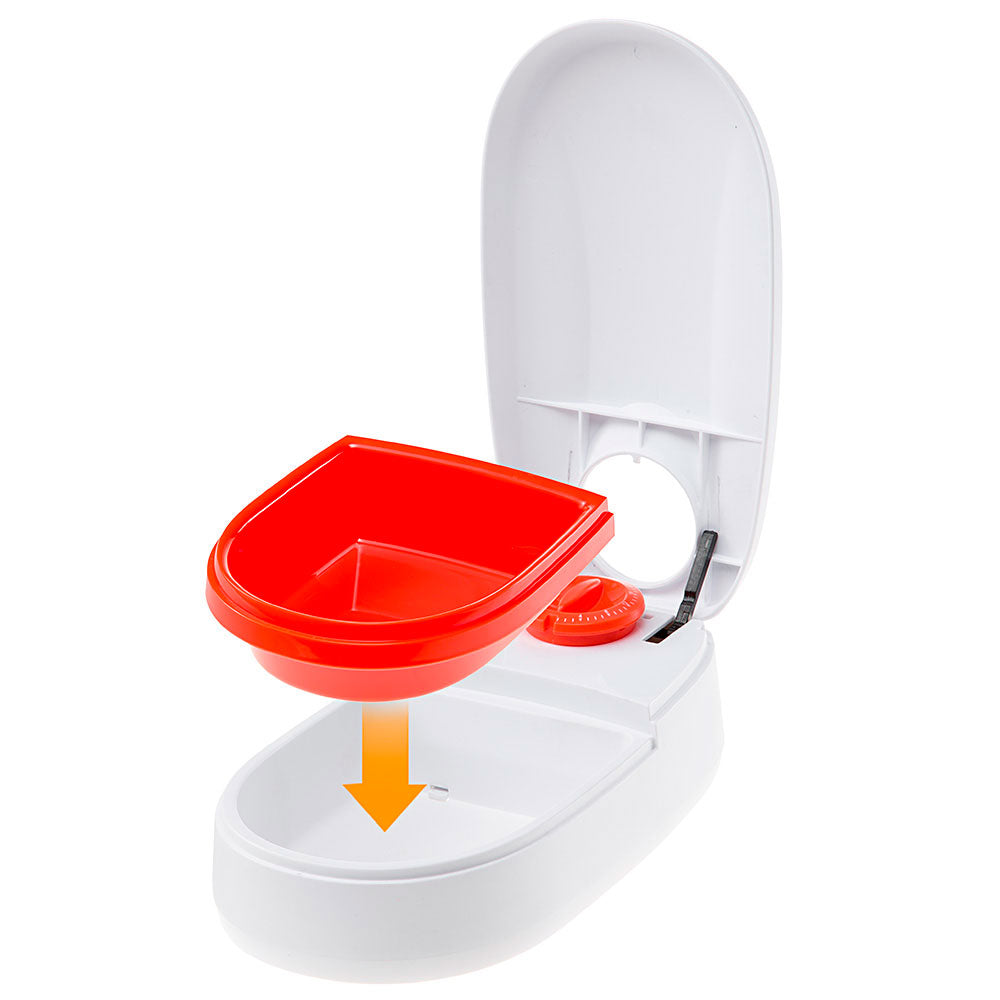 E’ consigliabile che il vostro animale si abitui al distributore automatico quando voi siete presenti. Una volta che il vostro animale si è abituato, poi, potete procedere alla programmazione. I gatti solitamente hanno bisogno di più tempo per abituarsi mentre i cani devono essere sorvegliati durante il primo periodo di utilizzo perché potrebbero danneggiare il prodotto. Si suggerisce altresì di cominciare ad usare il distributore come una normale ciotola. Non utilizzate fin da subito il timer.