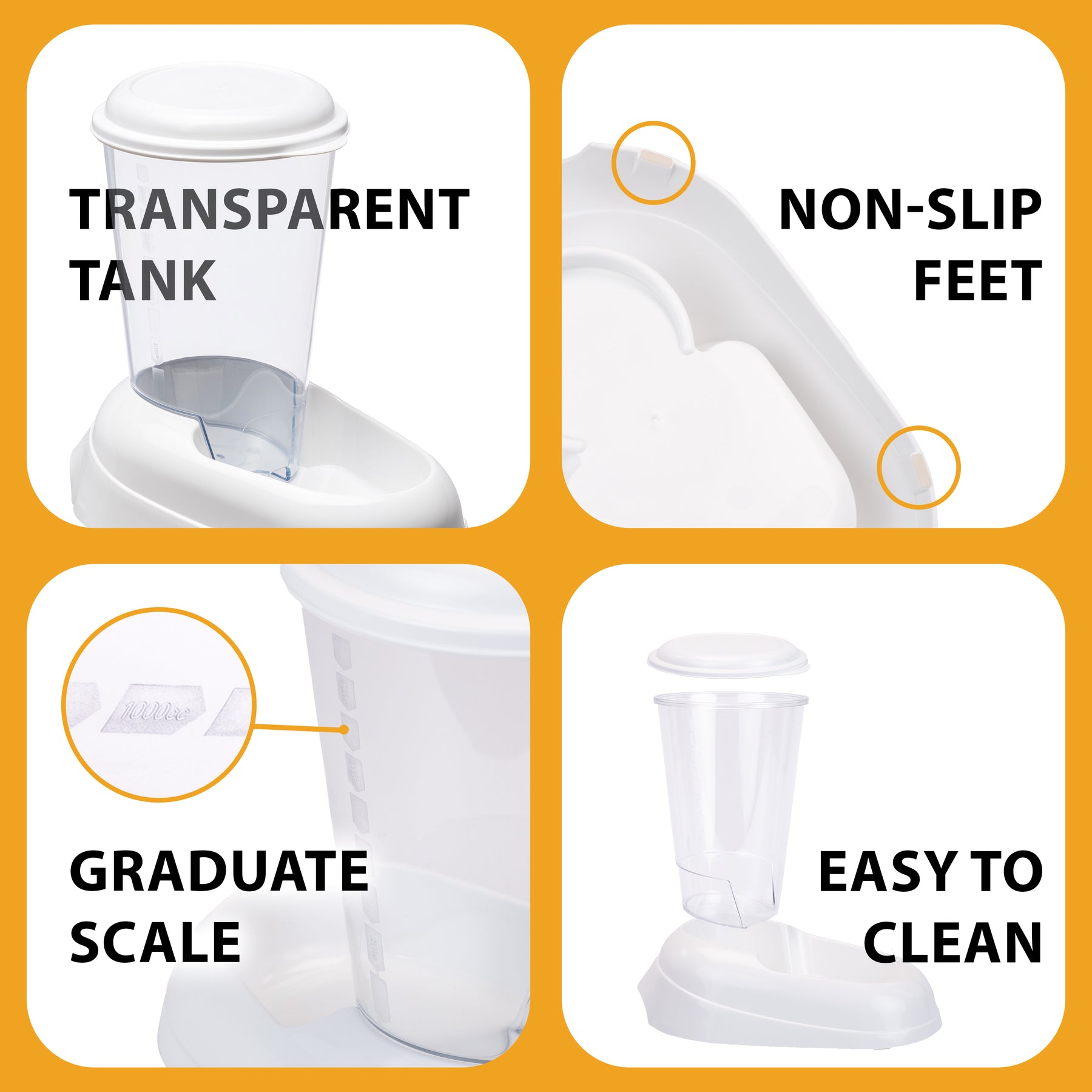 - Distributore in plastica con contenitore trasparente dotato di coperchio e scala graduata