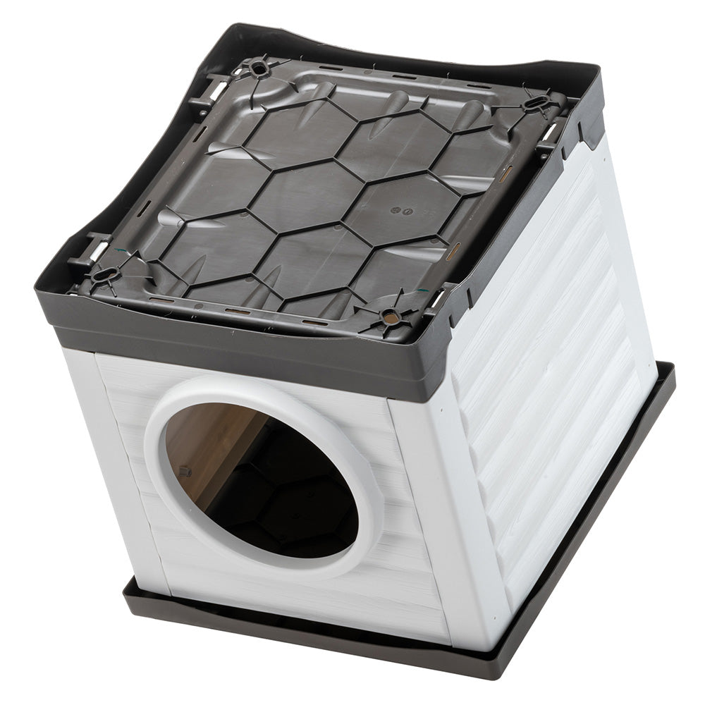 Realizzata in robusta resina termoplastica, materiale resistente agli urti e ai raggi UV, la cuccia da esterno per cani e gatti Petvilla è ideale per tutte le stagioni. Grazie all'ampio volume interno, assicura comfort e spazio al vostro animale. La particolare costruzione del fondo presenta apposite fessure per consentire il defluire dell'acqua verso l'esterno, evita il ristagno di liquidi a garanzia di un ambiente asciutto. Il tetto piatto può essere utilizzato come ripiano o zona relax per il vostro amico.