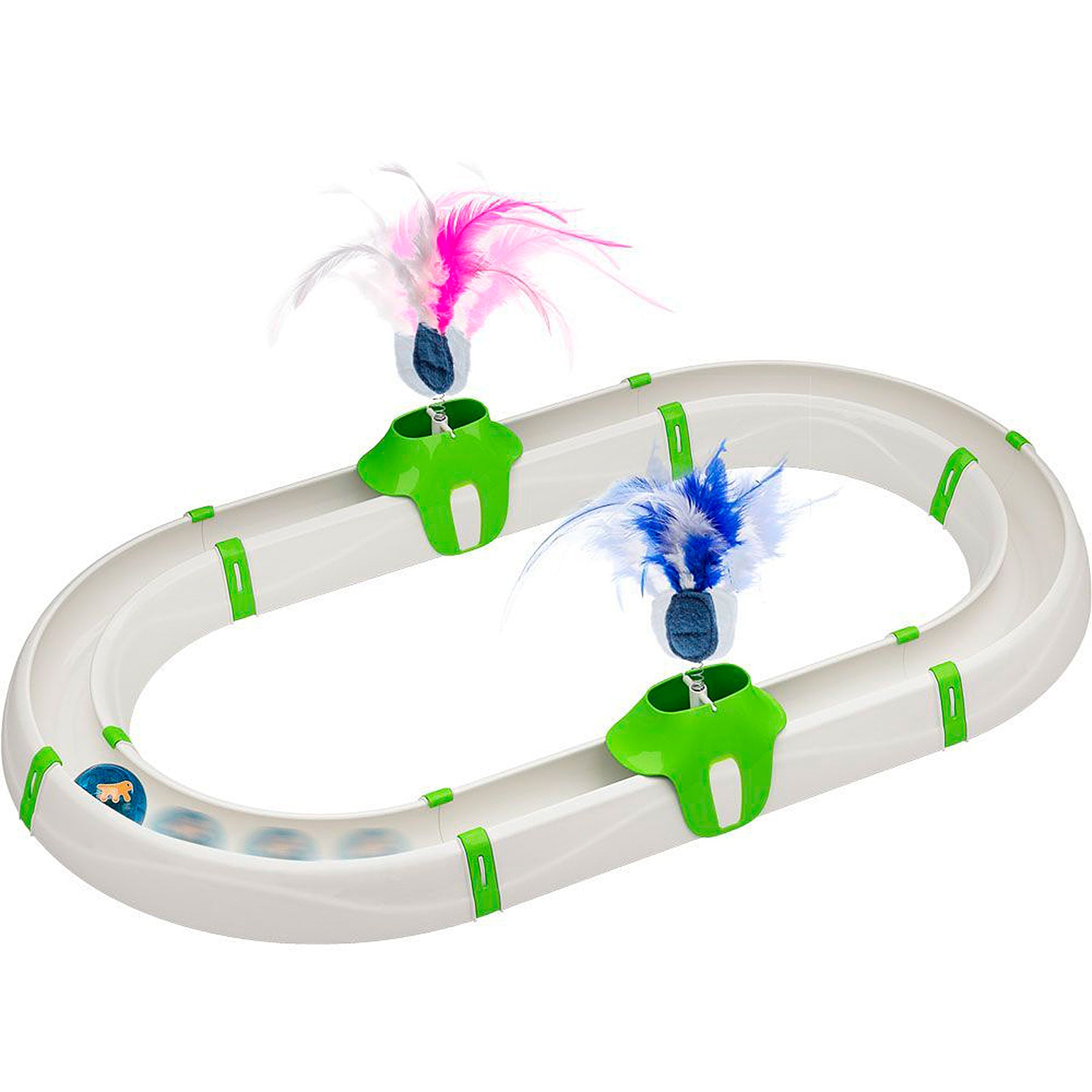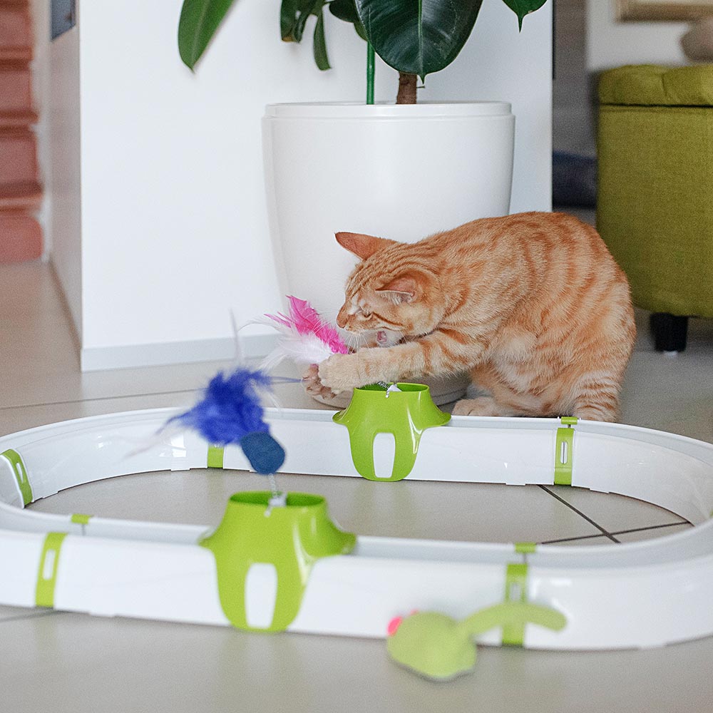 Turbine è un divertente gioco per gatti appartenente alla linea Clever & Happy, studiato appositamente per stimolare l'interesse dell'animale e mantenerlo sempre attivo e in perfetta salute. Il gioco, a forma di circuito, è costruito in robusta plastica ed è facile da assemblare. Inclusa all’interno della confezione troverete una simpatica pallina luminosa che si attiva col movimento, emettendo luce pulsante. Completano il tutto due simpatici pennacchi a molla con soffici piume: Micio si divertirà tantissimo ad afferrarli e farli oscillare, trascorrendo così tanti momenti felici.