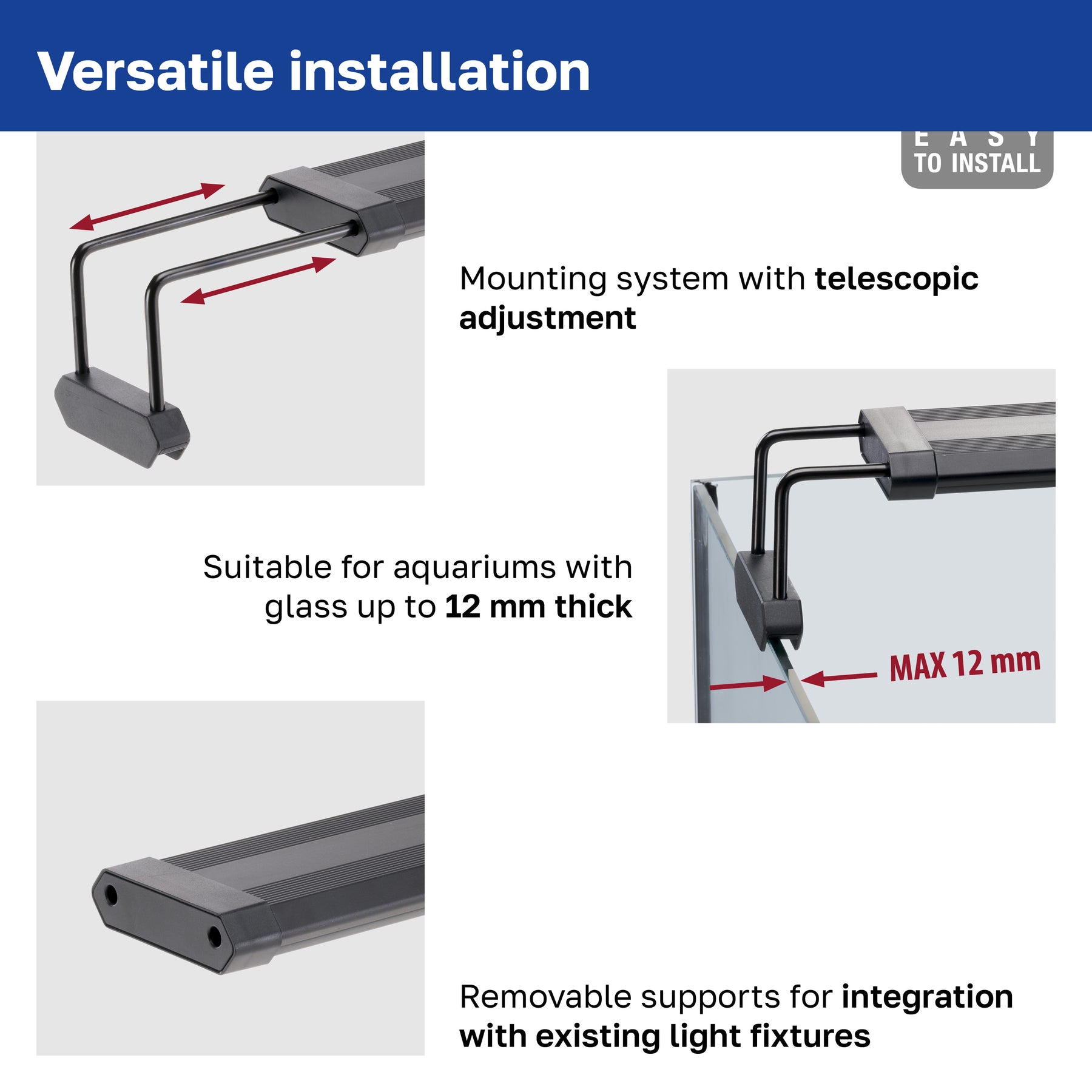 - Staffe estensibili e rimovibili, regolabili per adattarsi ad acquari aperti con vetri fino a 12 mm di spessore
