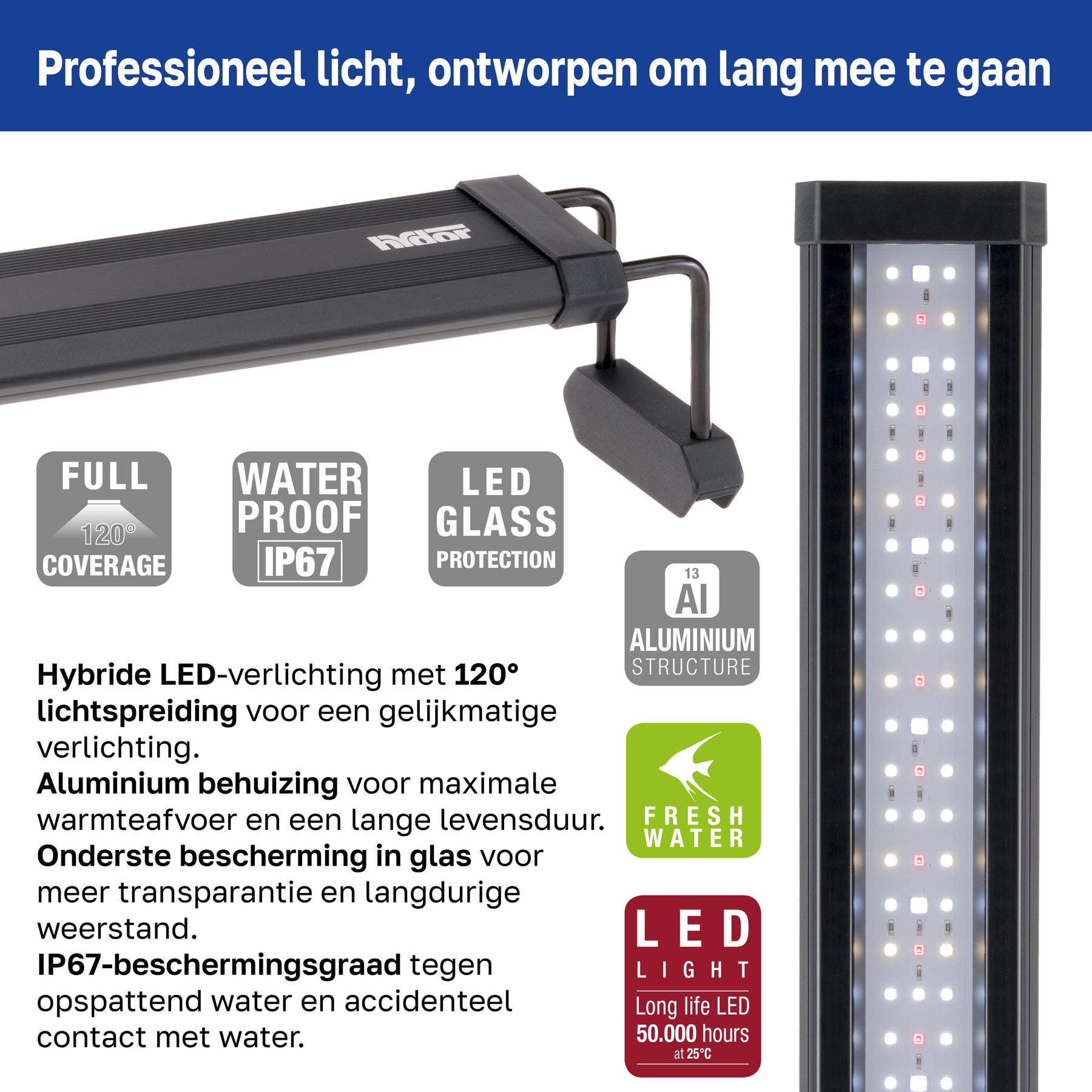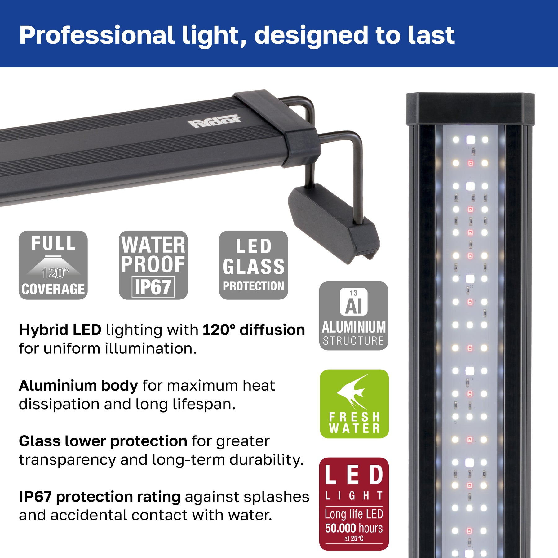 Le lampade AQ-LUX FRESH garantiscono un’illuminazione uniforme grazie al grande angolo di diffusione di 120°, che assicura una copertura ottimale della vasca, eliminando le zone d’ombra e offrendo un ambiente acquatico visivamente armonioso.