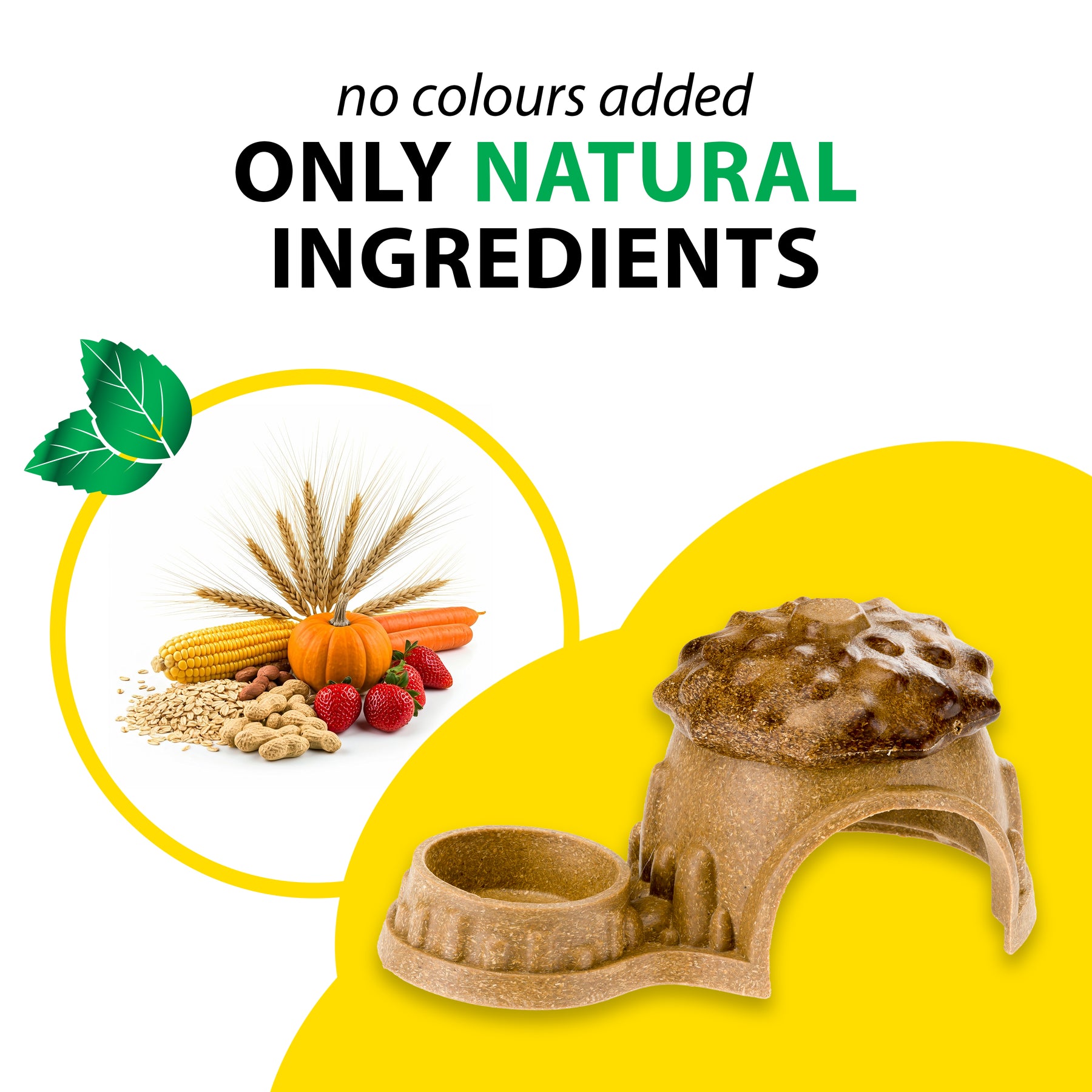 - Solo ingredienti naturali: steli di grano, crusca d’avena, fibra di pisello, farina di mais, steli di mais, zucca, glicerina vegetale, amido di mais, carota, erba medica, fragola, barbabietola, Haematococcus