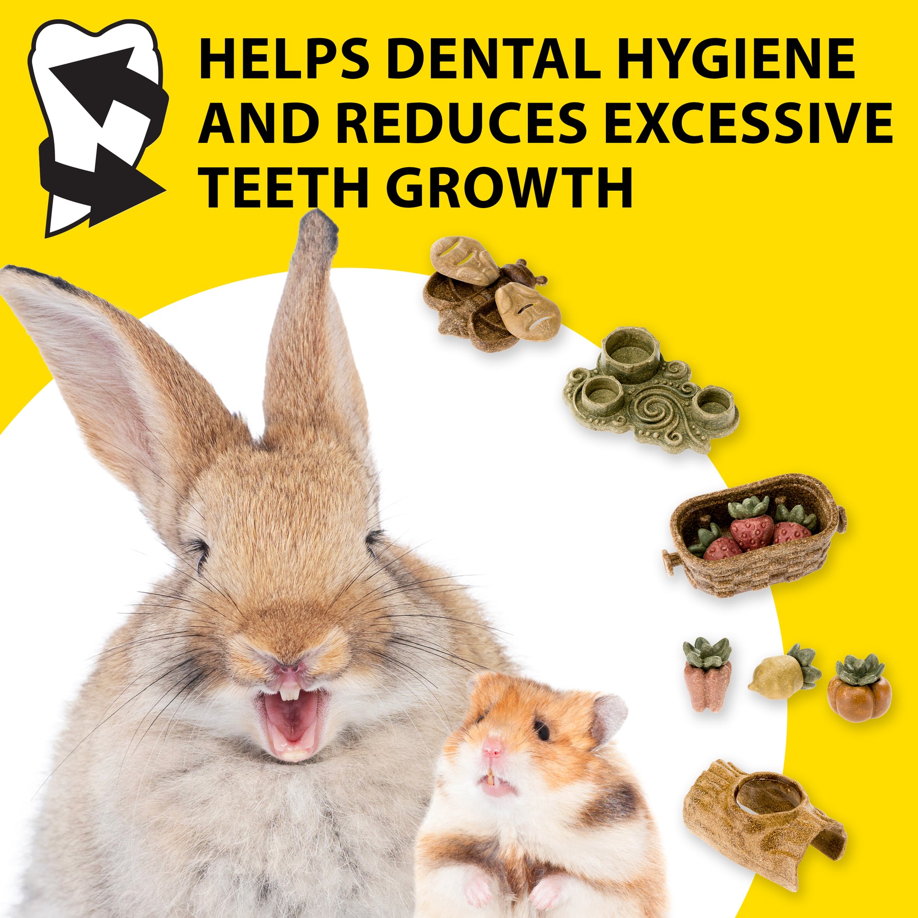 La texture dura e croccante è pensata per stimolare la masticazione e favorire il naturale consumo dei denti, che nei piccoli animali sono in continua crescita. L’attività masticatoria contribuisce così al mantenimento di una corretta igiene orale, aiutando a limitare una crescita eccessiva dei denti e supportando il benessere dentale nel tempo.
