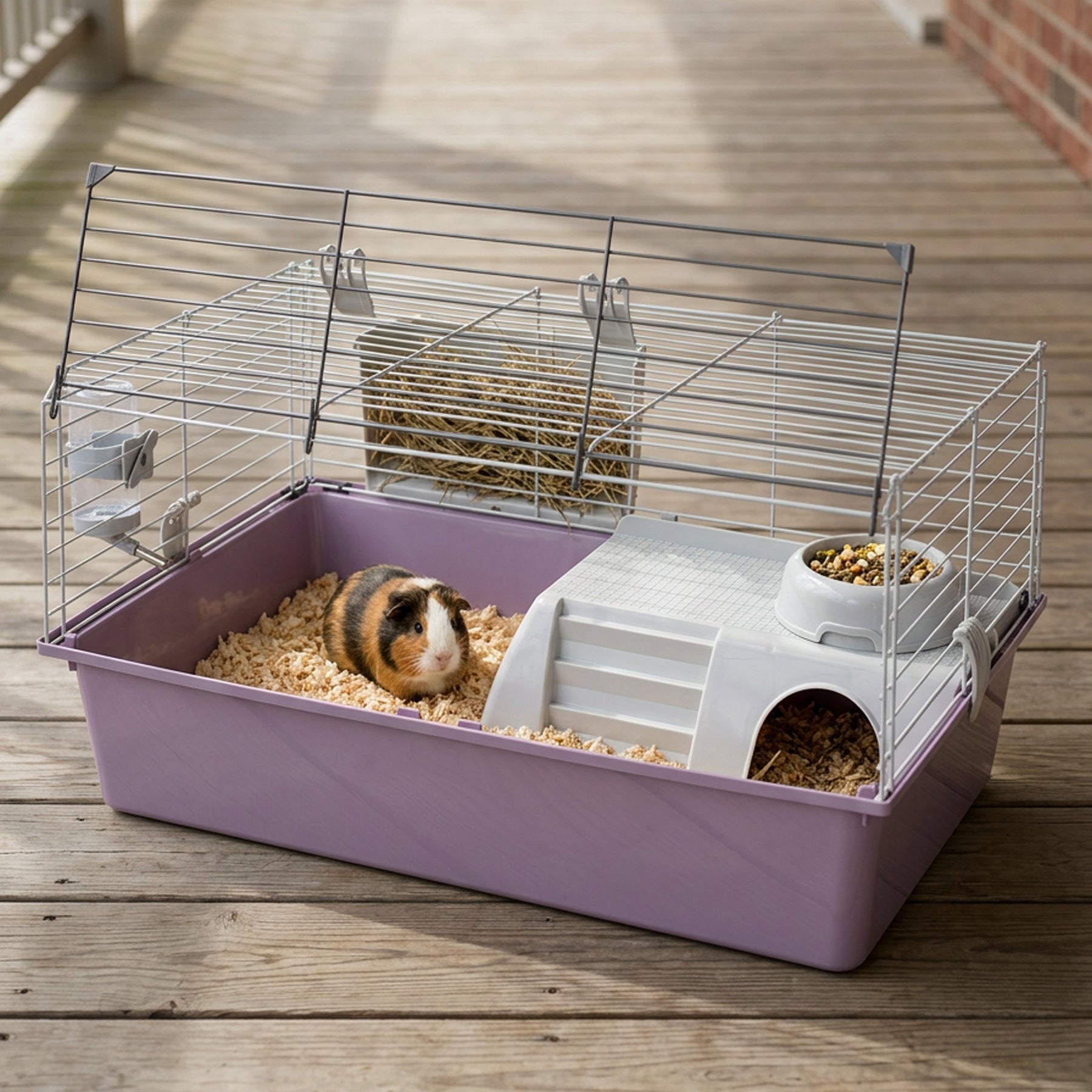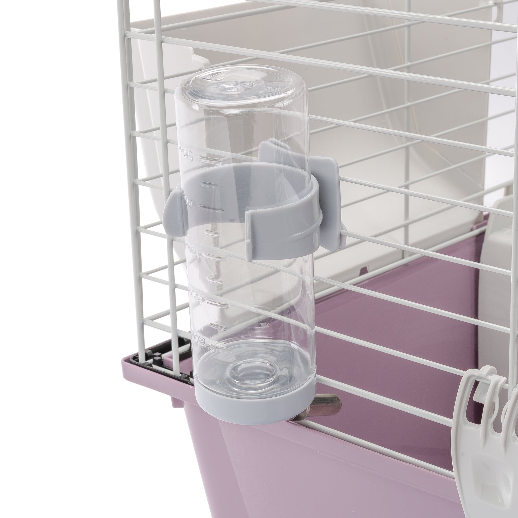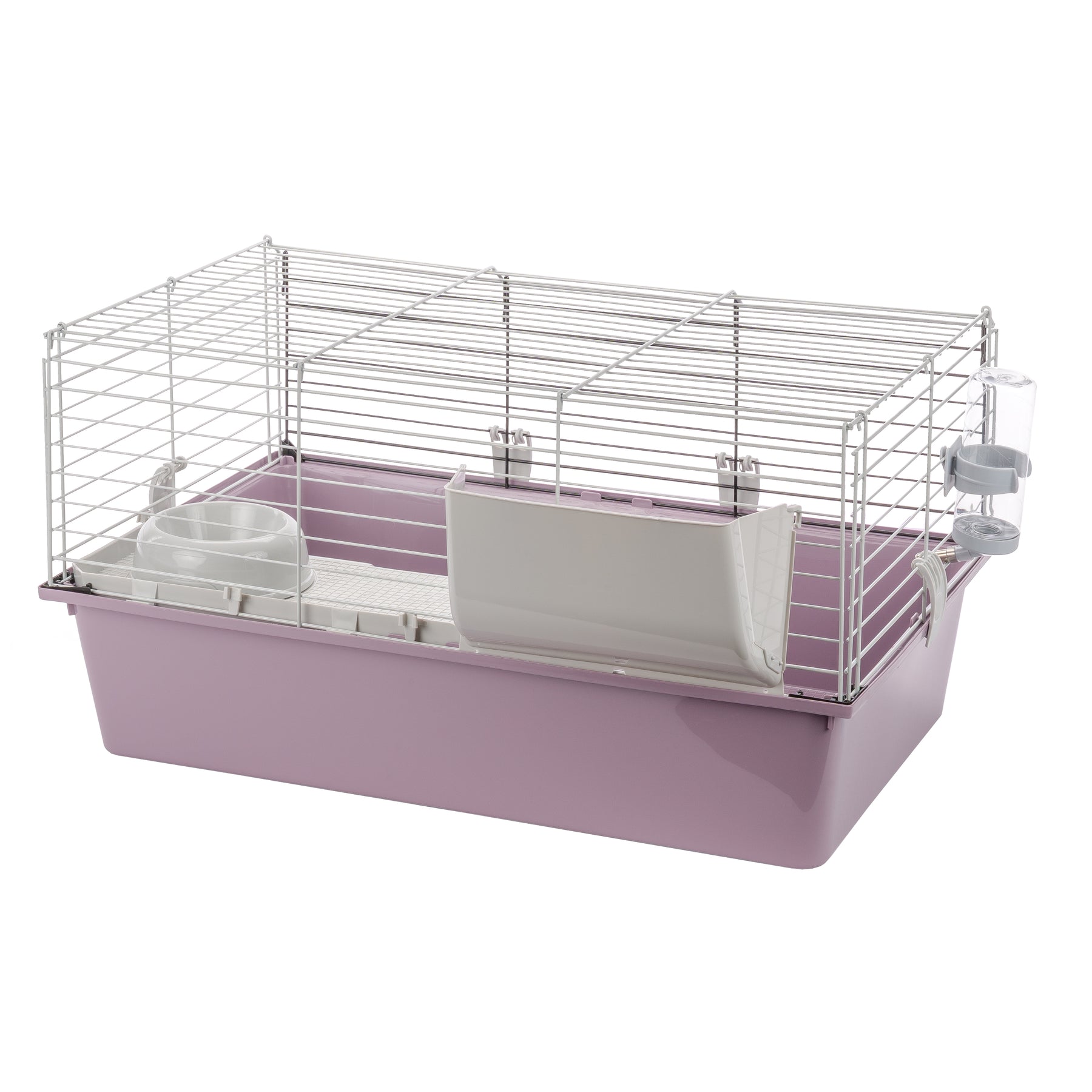 L'habitat ha una struttura tradizionale con alto e capiente fondo in plastica e struttura in rete metallica verniciata. All'interno, troverete accessori indispensabili come beverino, mangiatoia per il fieno, ciotola per il cibo e una comoda casetta in plastica per il riposo del roditore.