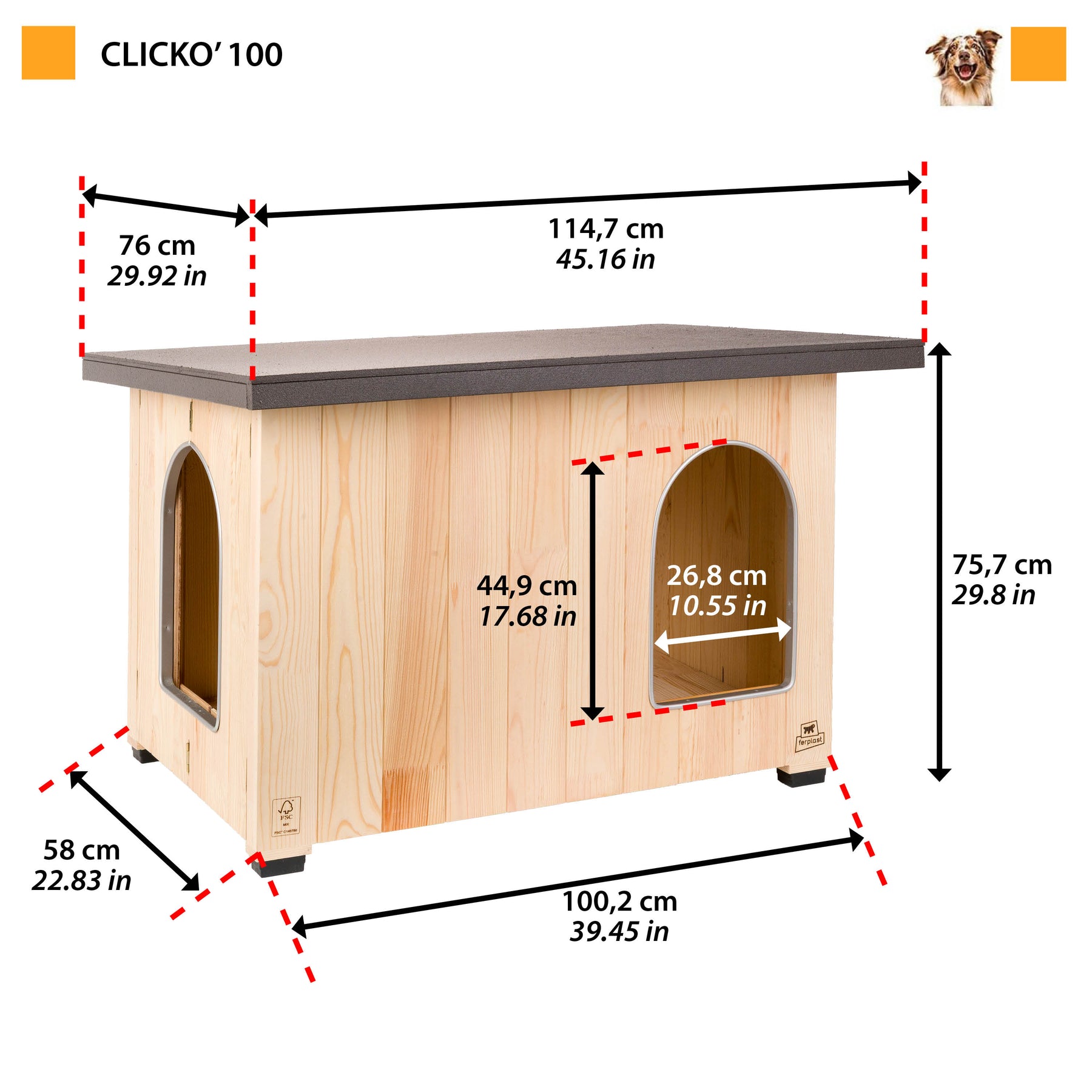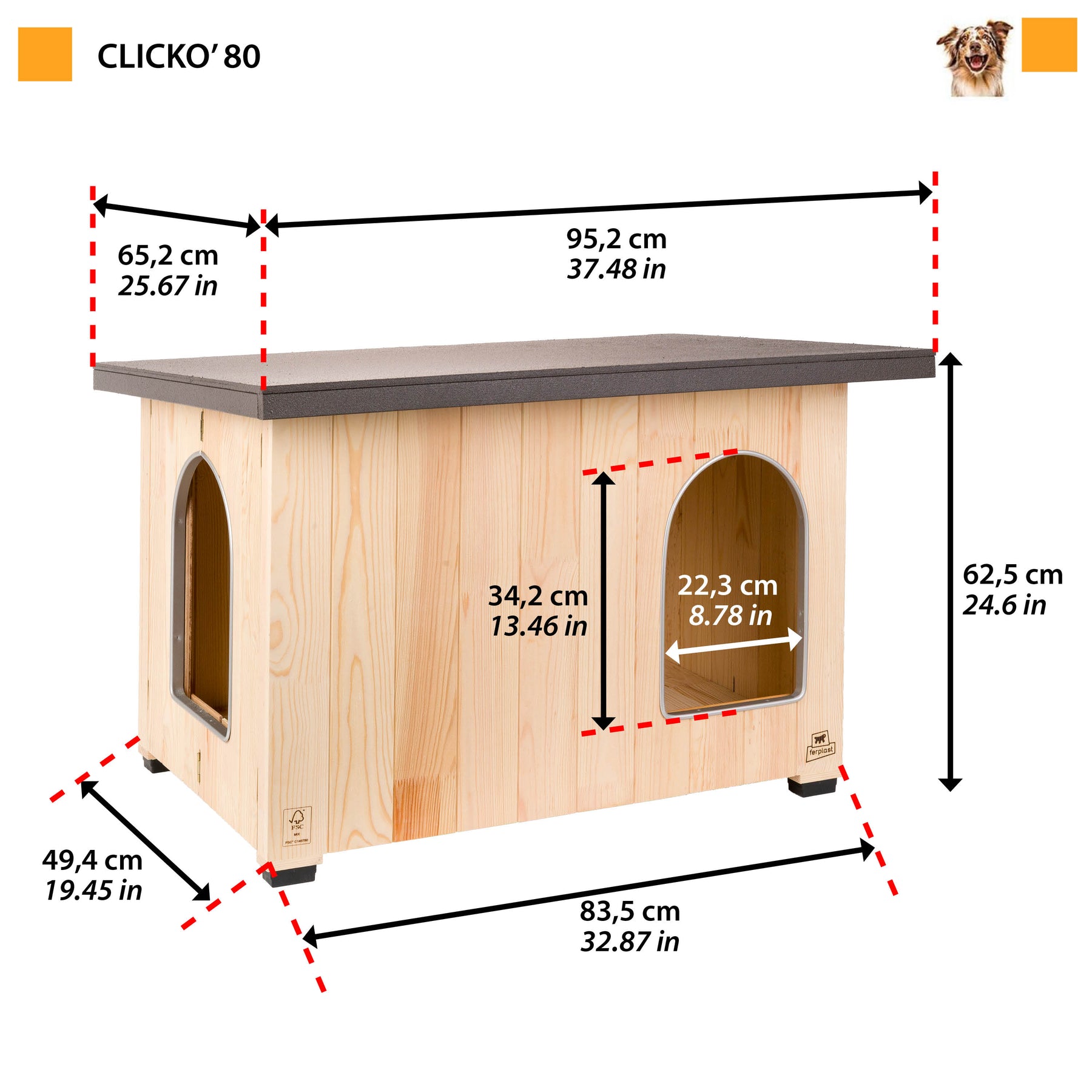 Cuccia in legno FSC™ per cani da esterno, montaggio immediato senza attrezzi. Pino nordico di alta qualità, doppia porta e design italiano.