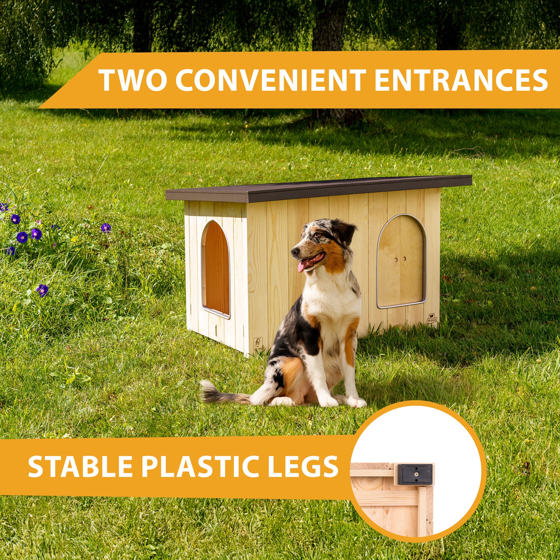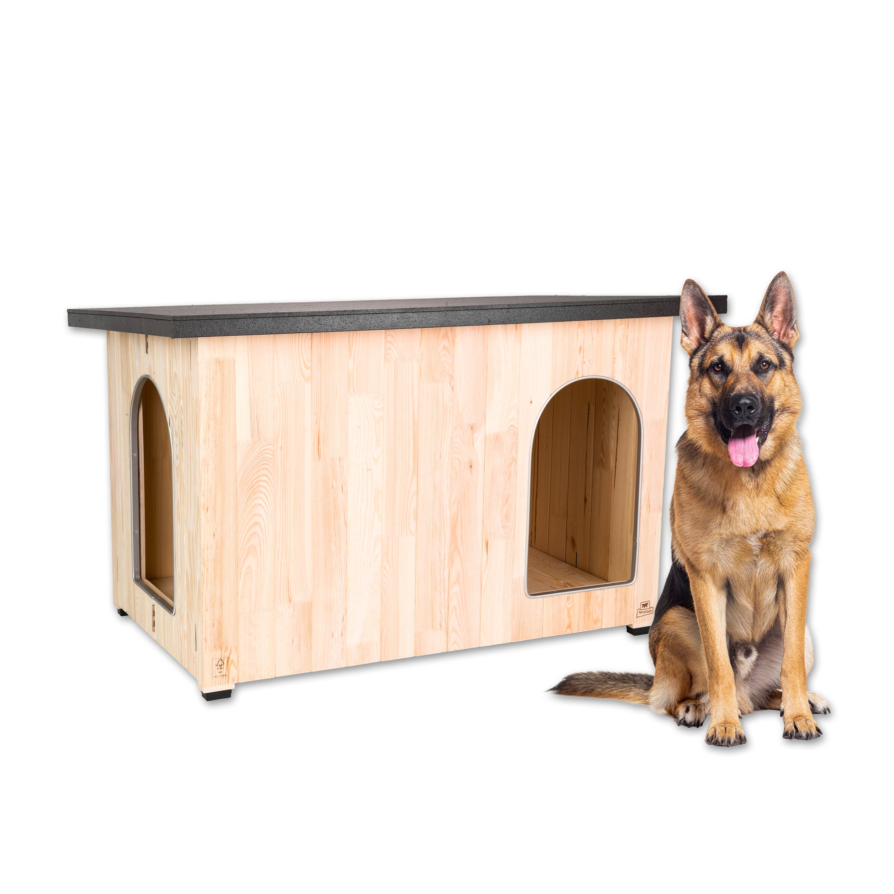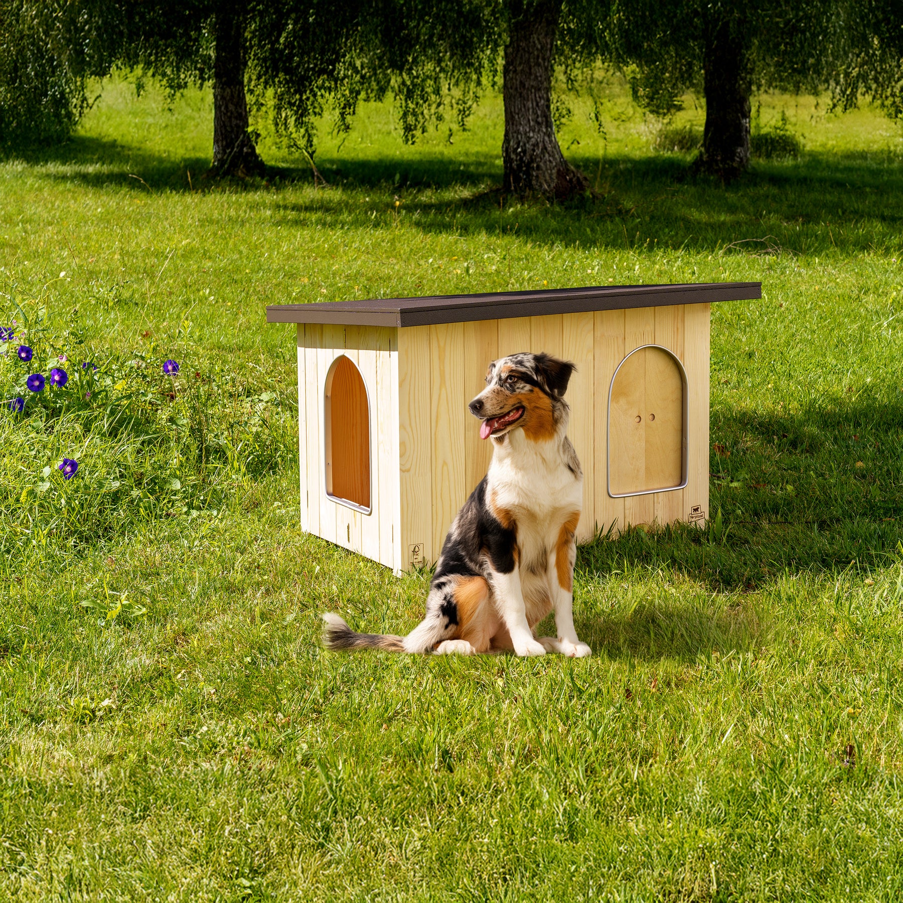 Le tavole sono assemblate con viti, evitando fessure e infiltrazioni d’aria e mantenendo l’ambiente interno più asciutto. Il legno certificato FSC™, proveniente da foreste gestite in modo responsabile, garantisce un prodotto rispettoso della natura e di elevata qualità. L’intera struttura è trattata con vernici a base d’acqua, atossiche e inodori, sicure per la salute del cane; una vernice specifica protegge inoltre il legno dai raggi UV, preservandone l’integrità nel tempo. Il tetto pendente è trattato con resina impermeabile, assicurando una protezione efficace da pioggia e umidità.