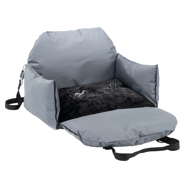 Il comfort è assicurato in ogni stagione grazie al doppio cuscino reversibile. Da un lato, la morbida pelliccia ecologica offre un nido accogliente e caldo per i mesi invernali, mentre il lato in tessuto antigraffio e idrorepellente è ideale per mantenere il cane fresco e comodo durante i mesi estivi. Il trasportino presenta inoltre il lato frontale apribile: ciò consente di creare un ulteriore spazio o zona di relax per il vostro amico.