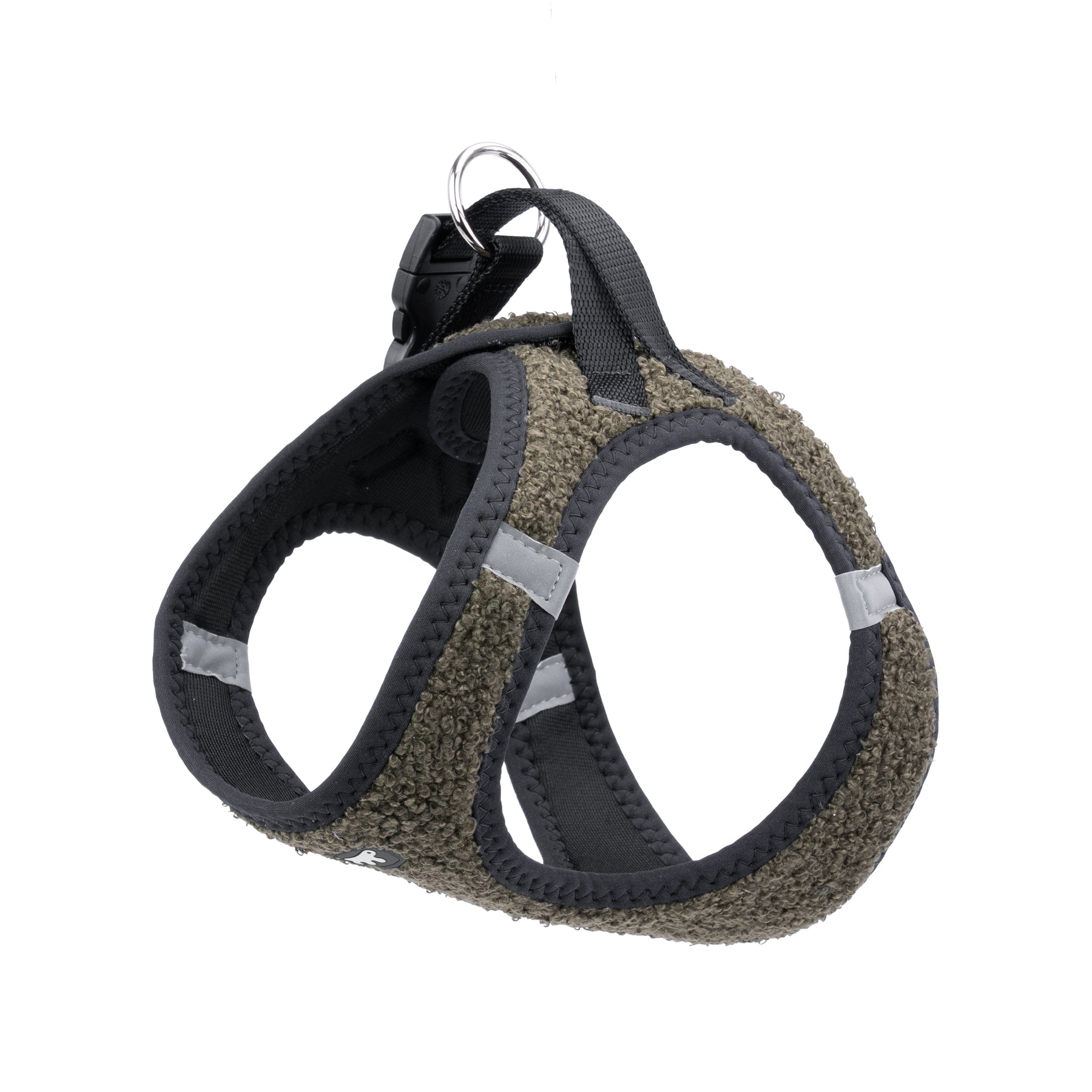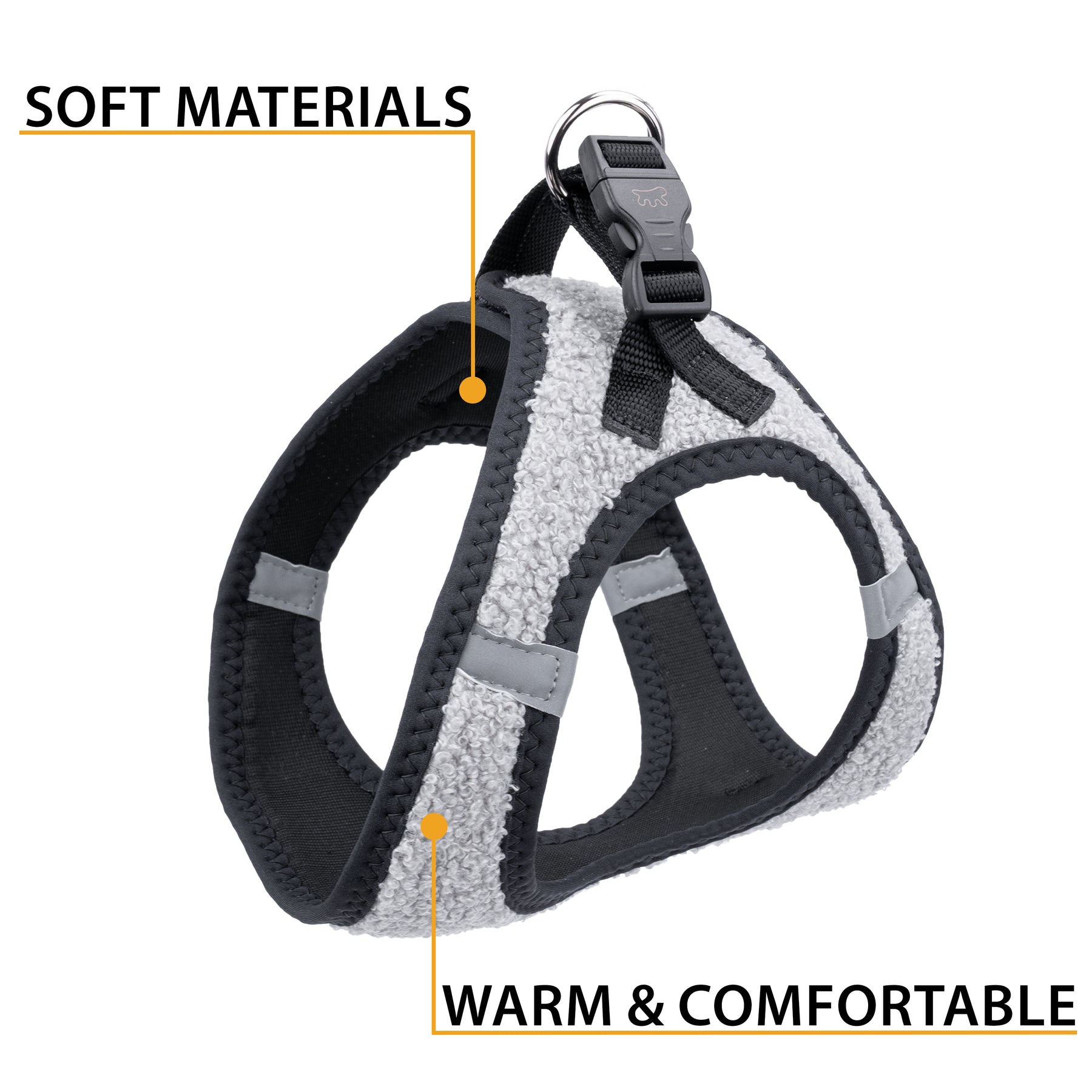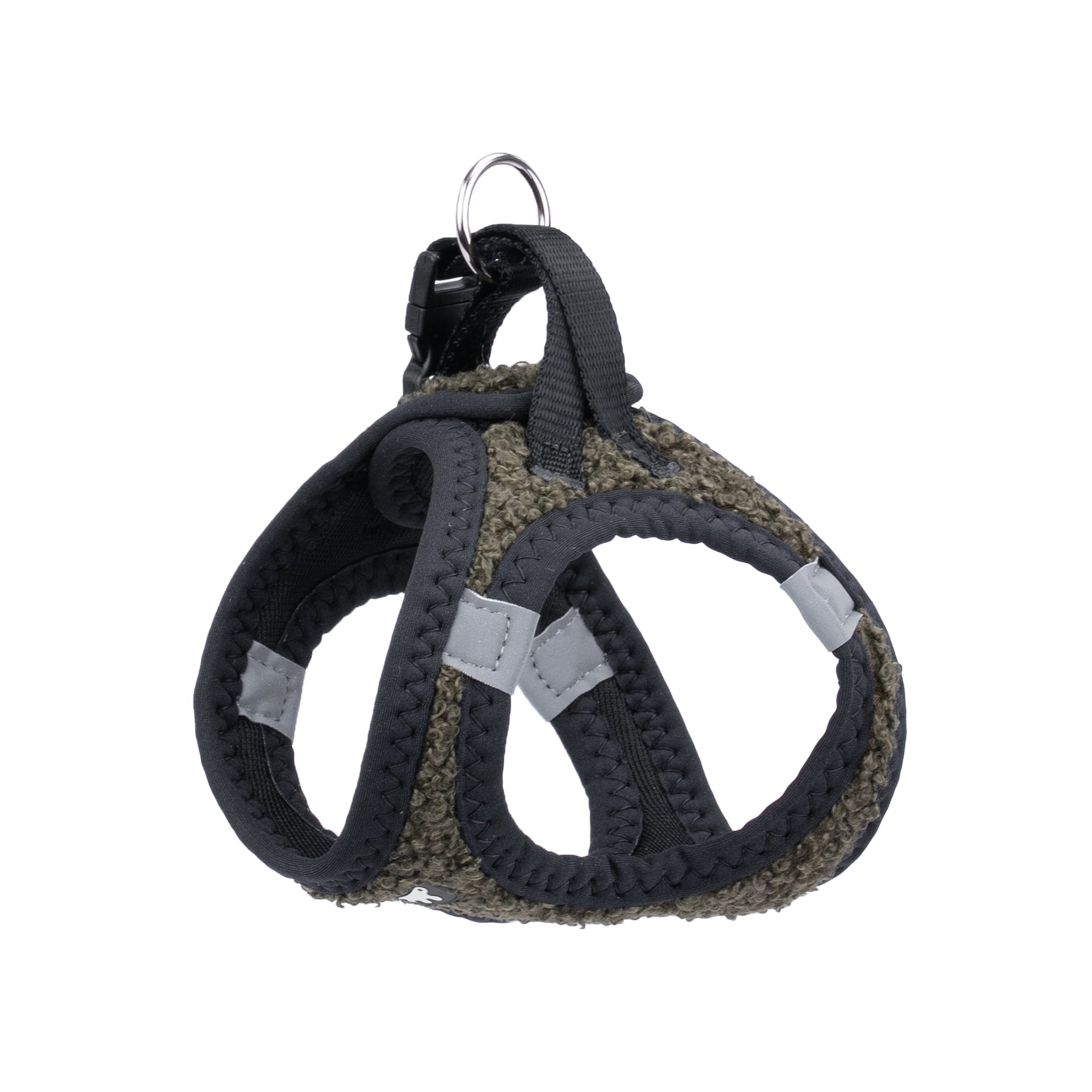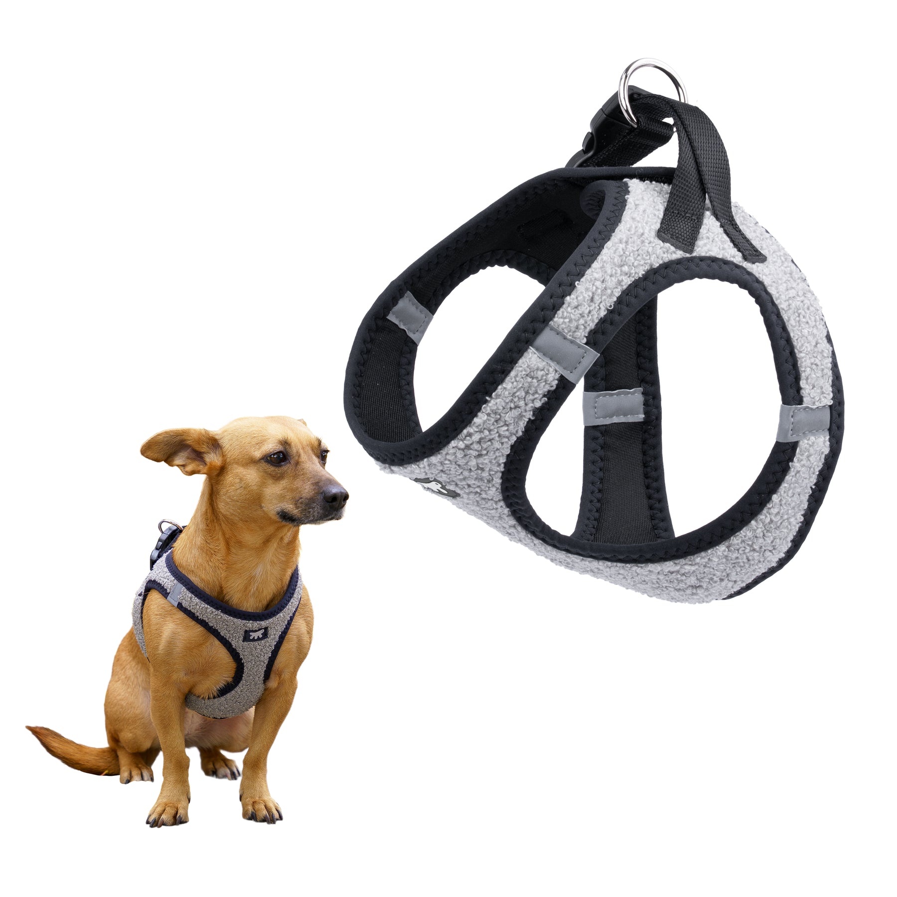Facile da indossare e regolare, è provvista di fibbie scorrevoli per una vestibilità su misura e di una clip a scatto per una chiusura pratica e sicura. I doppi anelli in metallo offrono un solido aggancio per il guinzaglio.