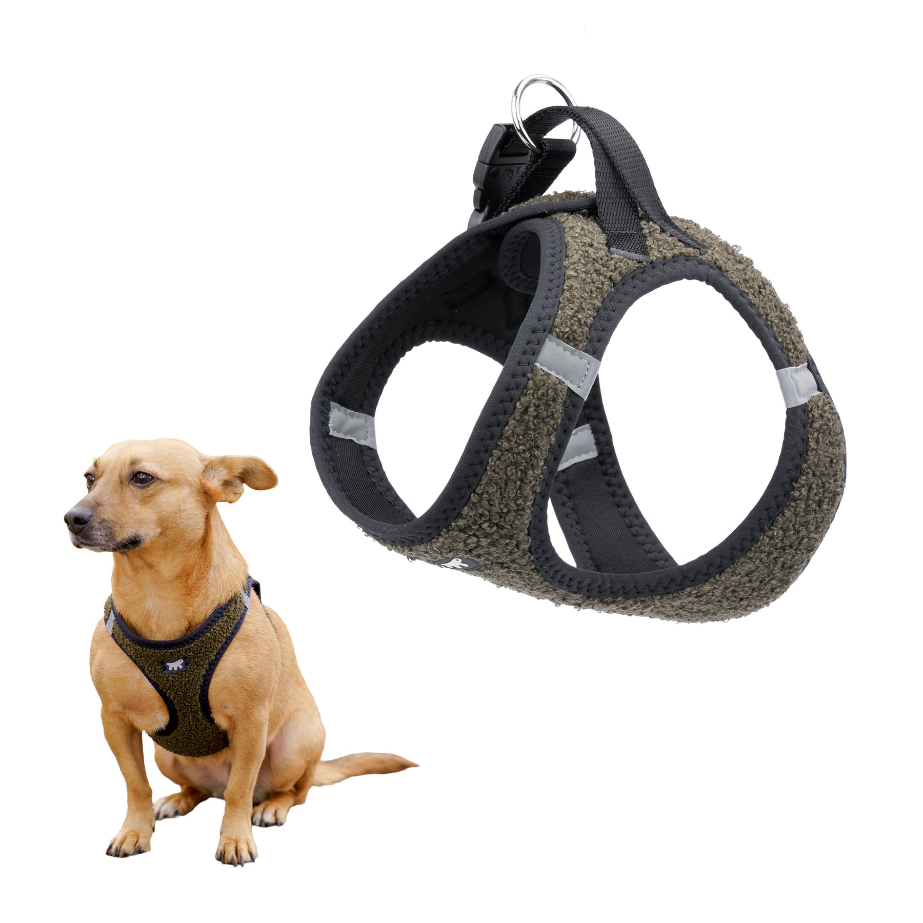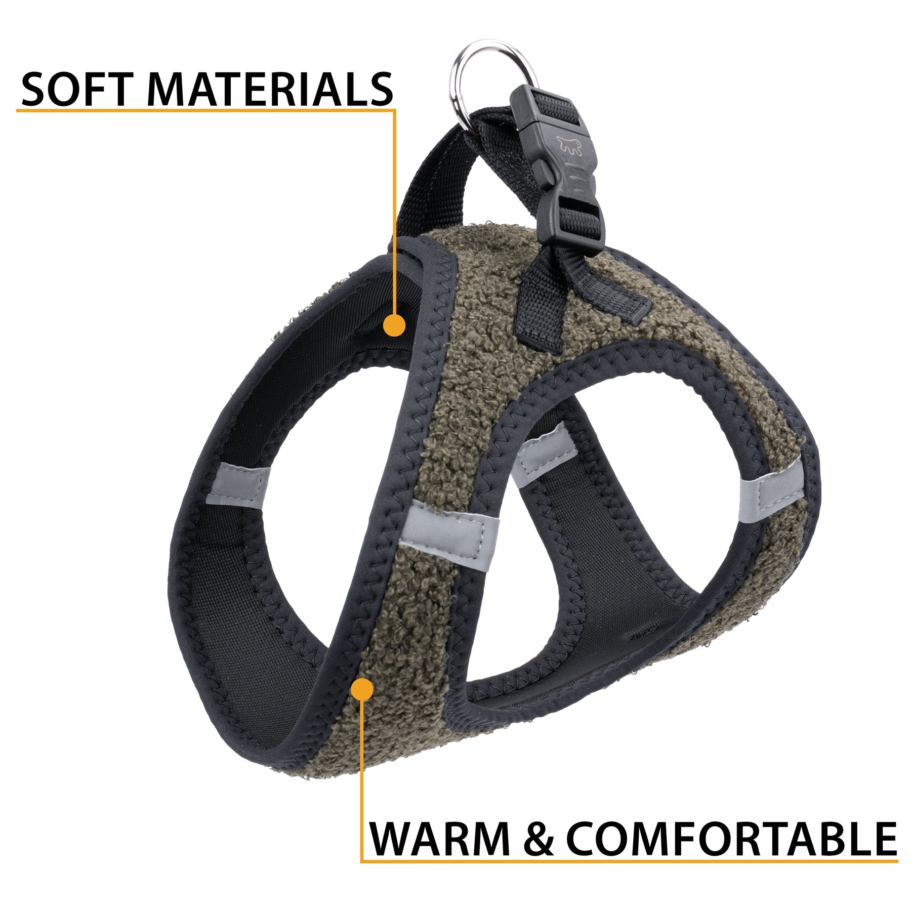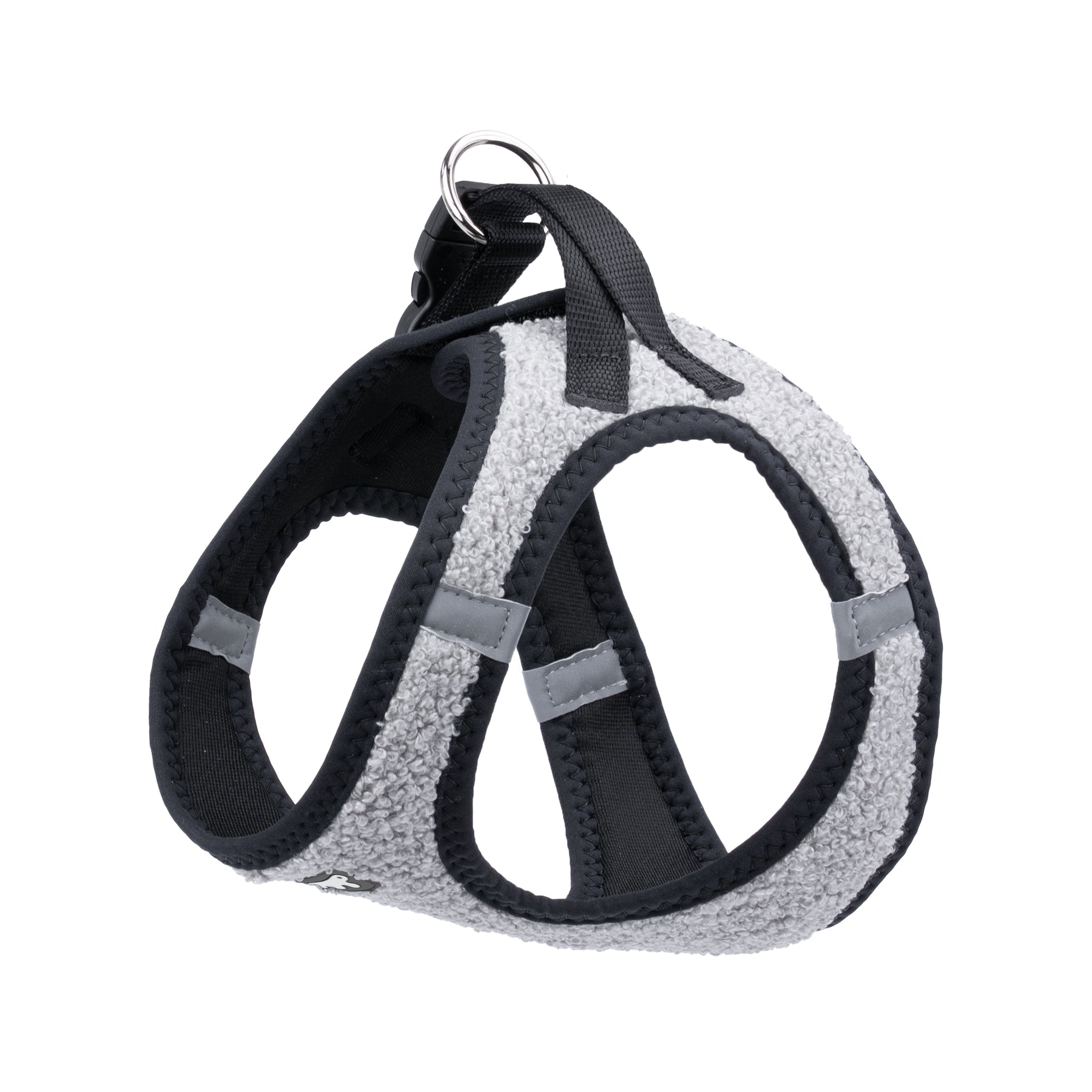 Facile da indossare e regolare, è provvista di fibbie scorrevoli per una vestibilità su misura e di una clip a scatto per una chiusura pratica e sicura. I doppi anelli in metallo offrono un solido aggancio per il guinzaglio.