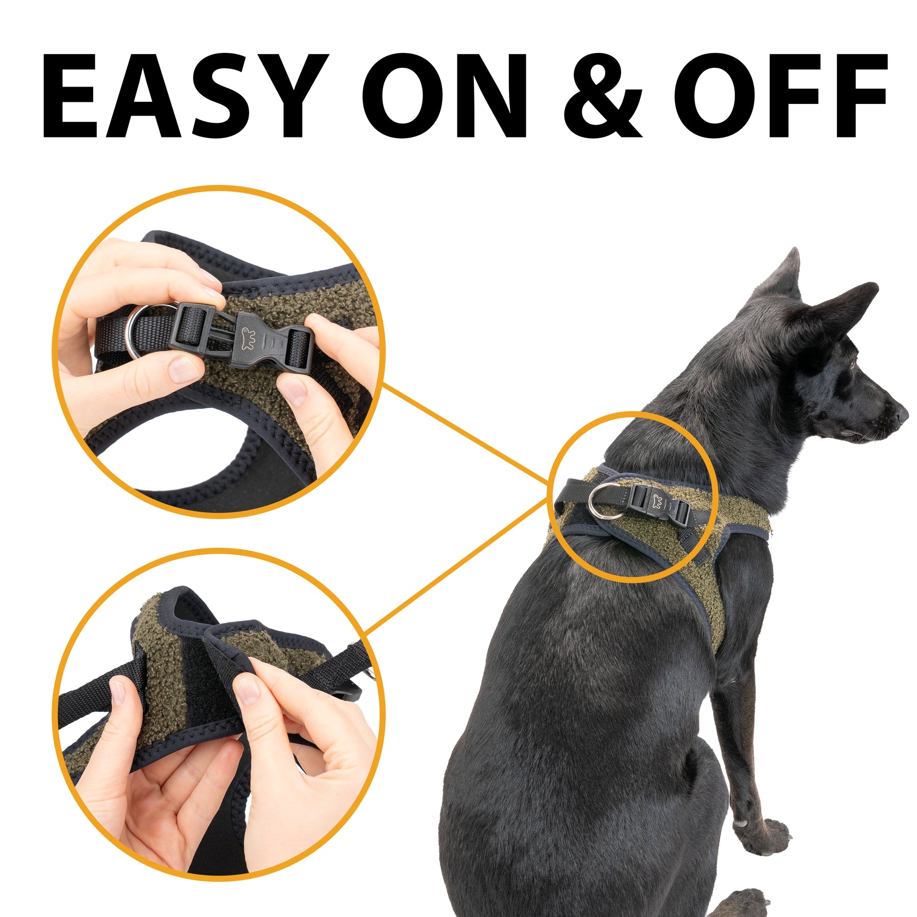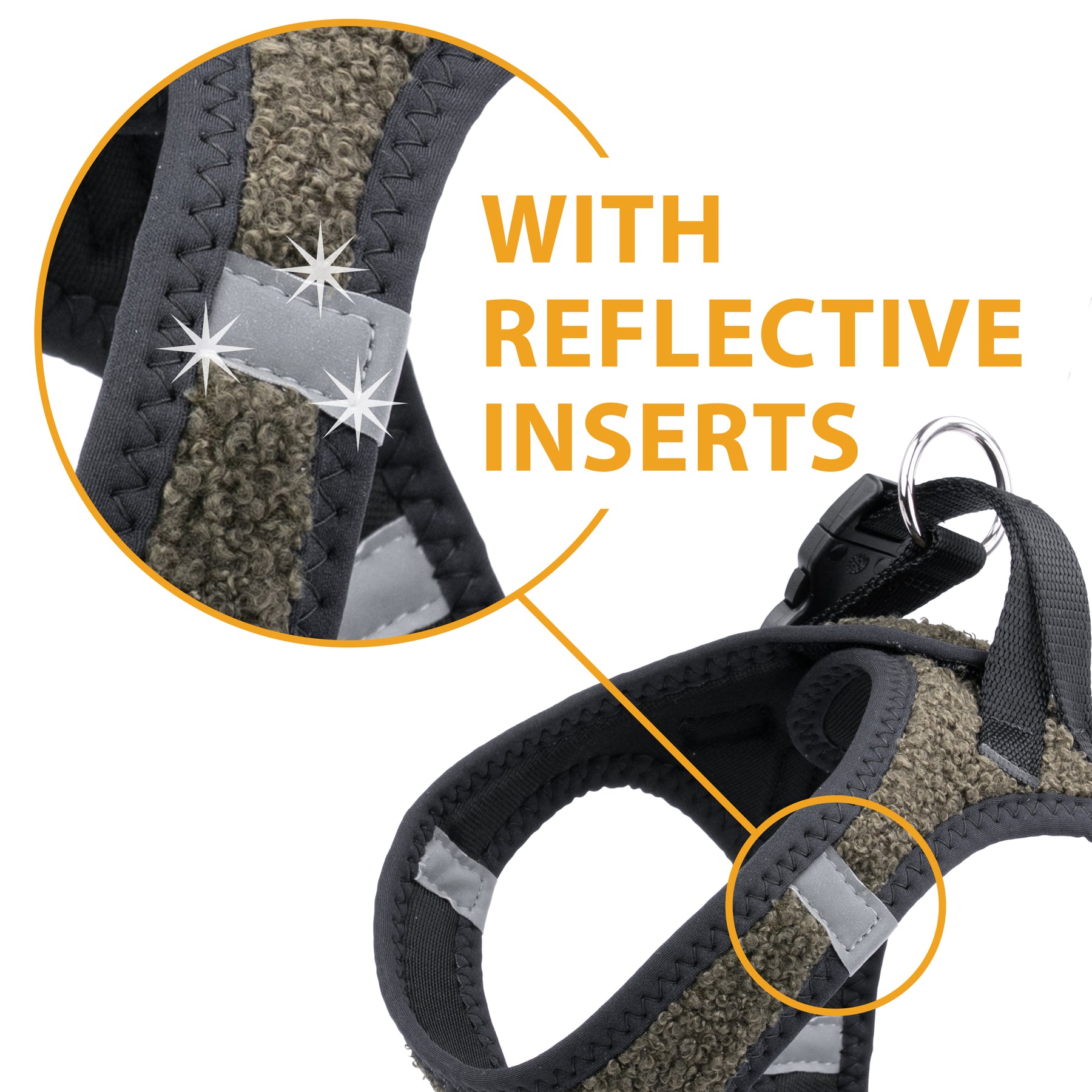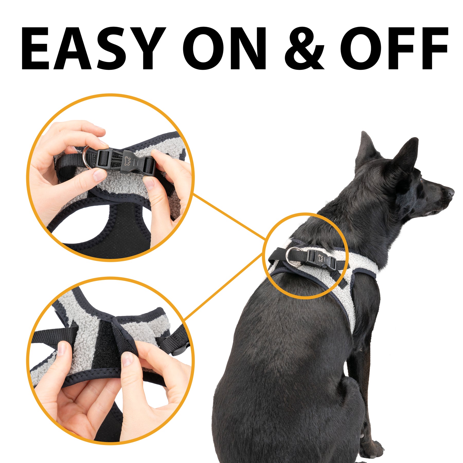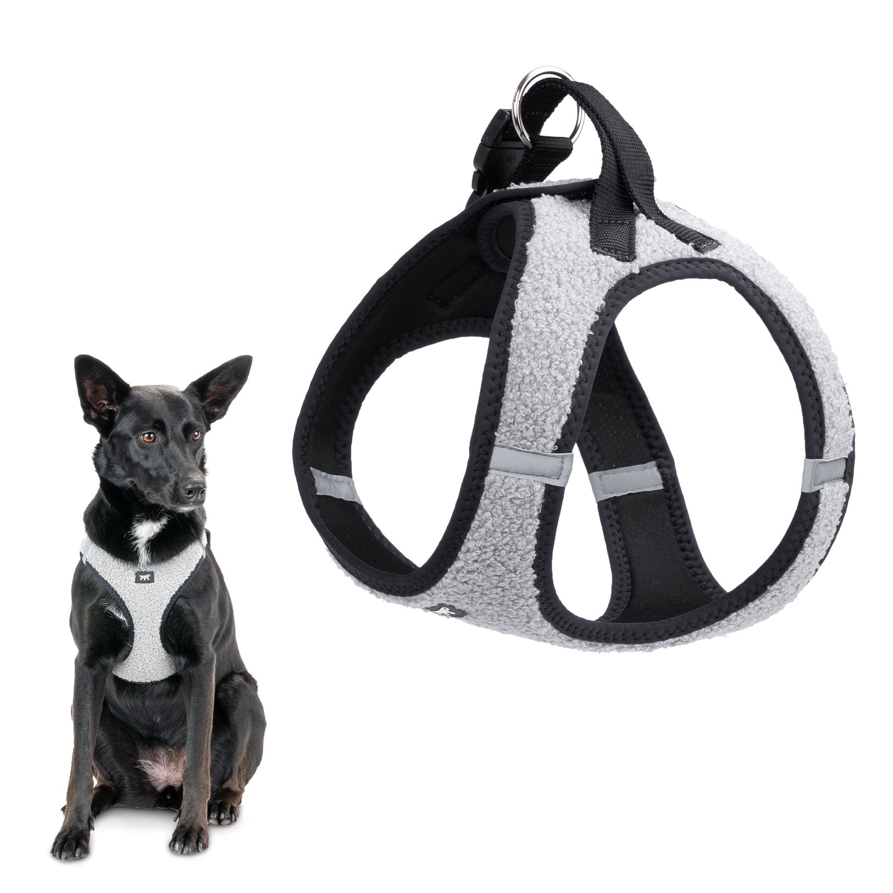 Facile da indossare e regolare, è provvista di fibbie scorrevoli per una vestibilità su misura e di una clip a scatto per una chiusura pratica e sicura. I doppi anelli in metallo offrono un solido aggancio per il guinzaglio.