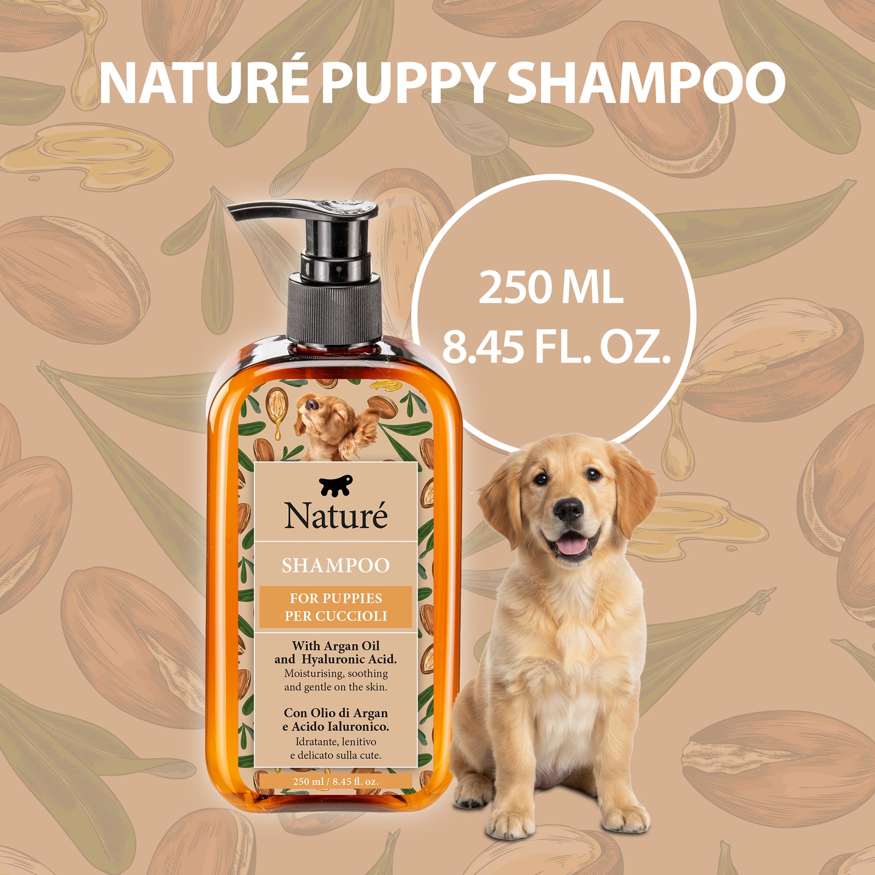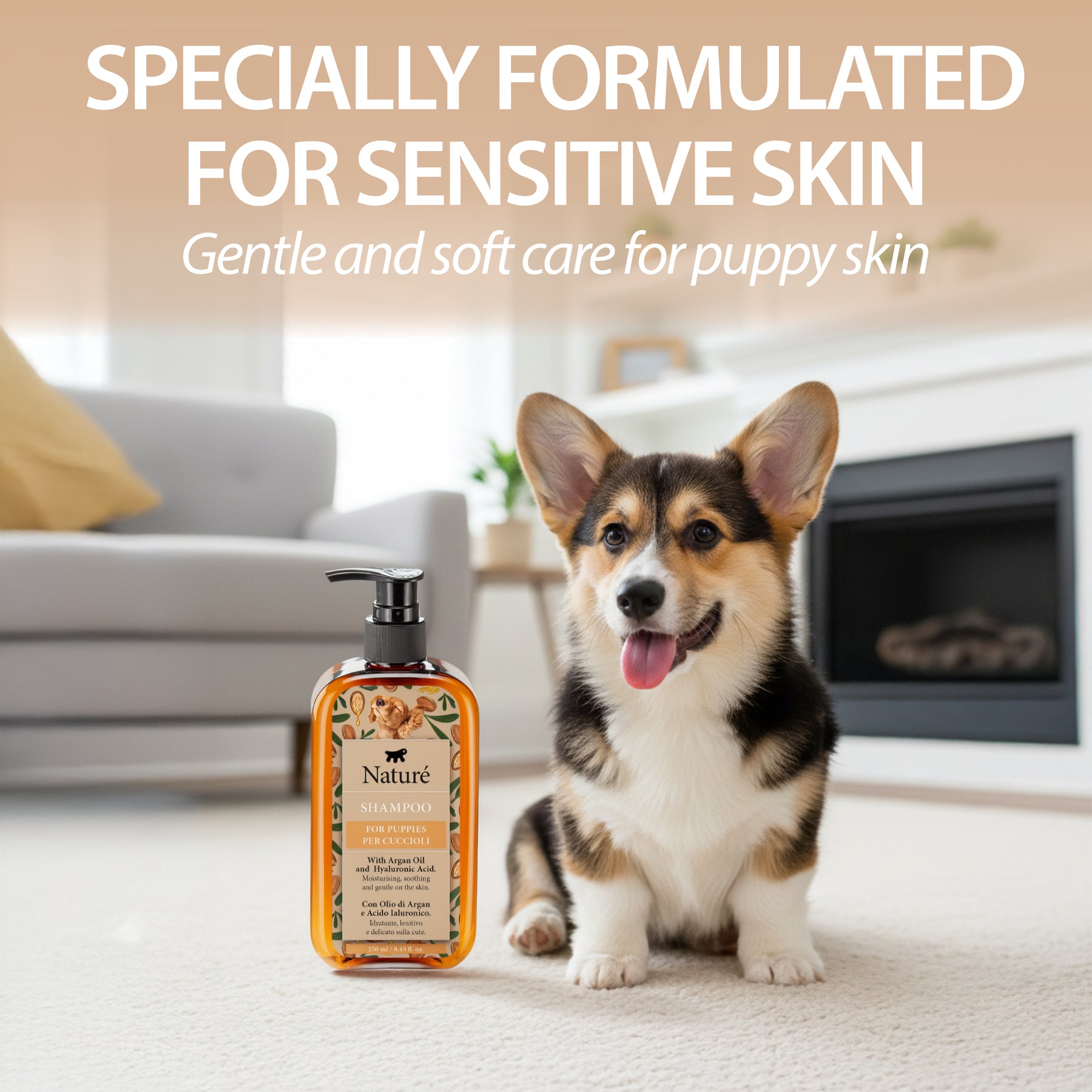 Shampoo per cuccioli, naturale e ultra delicato, con Olio di Argan e Acido Ialuronico. Idrata e rispetta la cute sensibile.