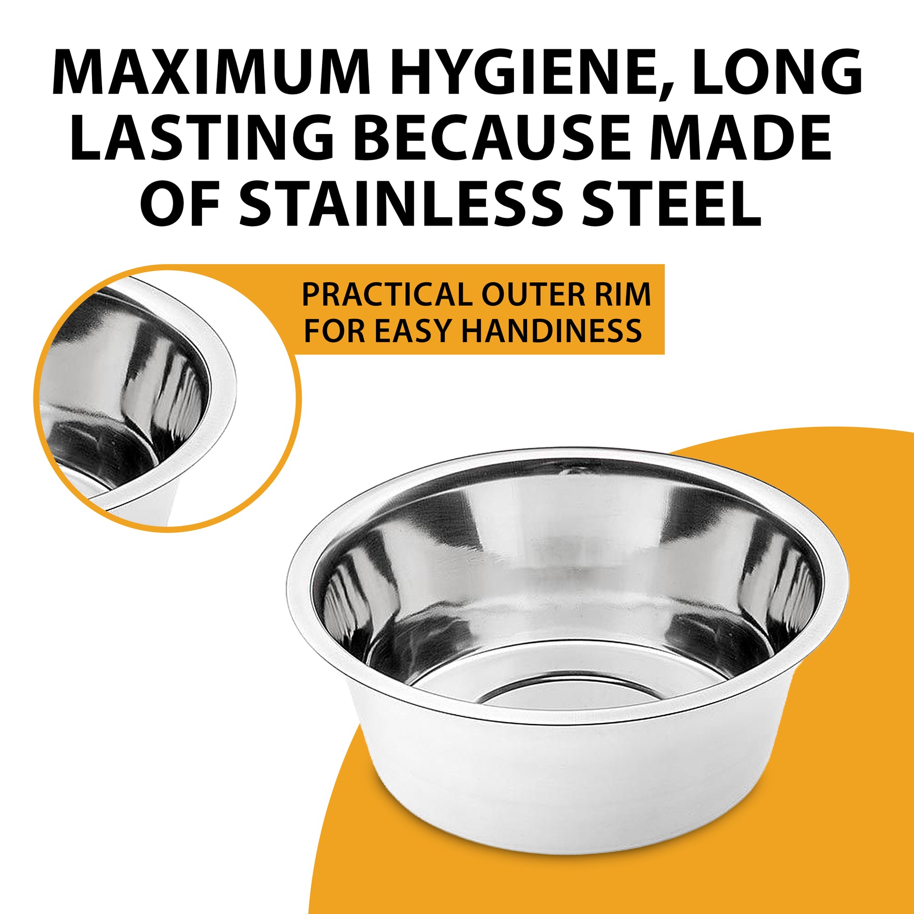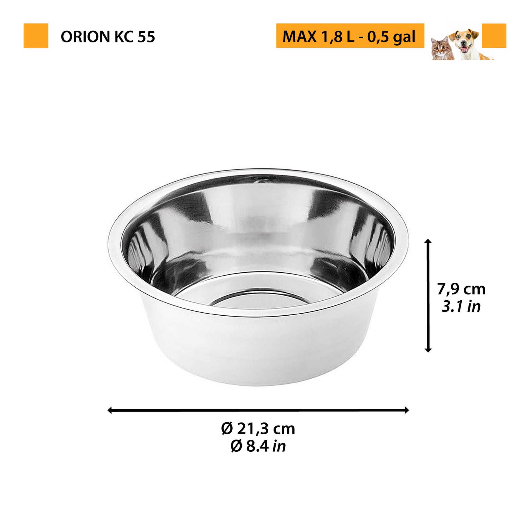La gamma di ciotole in acciaio inox Orion propone diverse misure per tutti i cani: 0.25, 0.5, 0.85, 1.2, 1.8, 2.8 e 4.5 litri.