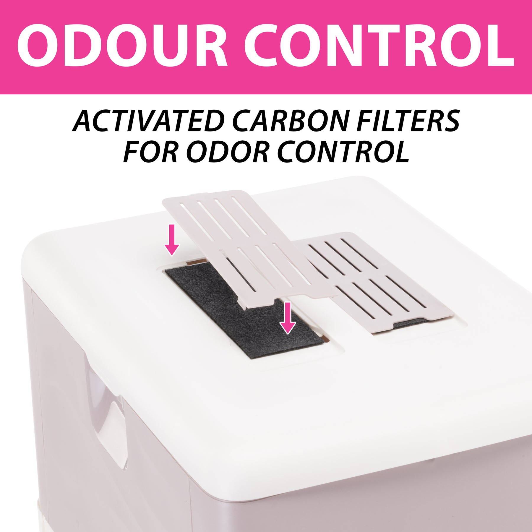 Sahara è inoltre equipaggiata con due filtri ai carboni attivi che neutralizzano i cattivi odori, contribuendo a mantenere un ambiente fresco. Il design anti-perdite evita fuoriuscite accidentali di urina o lettiera, mentre le dimensioni compatte la rendono ideale anche per ambienti più piccoli.