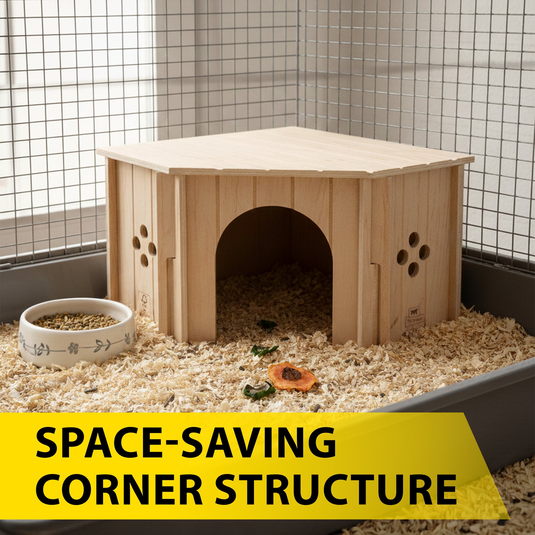 SIN CORNER è una casetta in legno progettata per offrire ai piccoli animali un rifugio naturale, confortevole e ben integrato all’interno della gabbia. La sua forma angolare salvaspazio consente di sfruttare in modo intelligente gli angoli dell’habitat, lasciando maggiore libertà di movimento all’animale e migliorando l’organizzazione dello spazio interno.