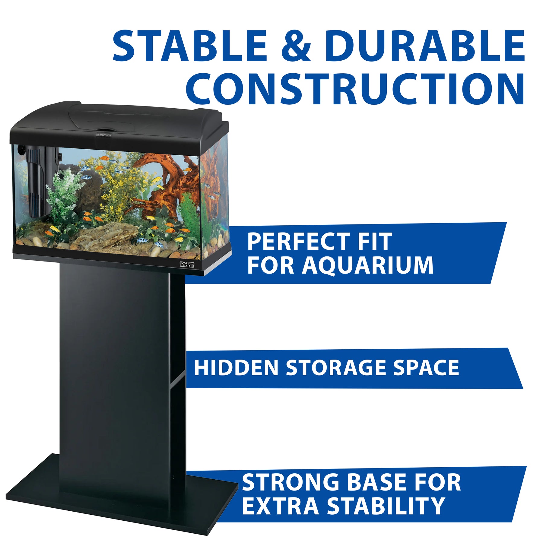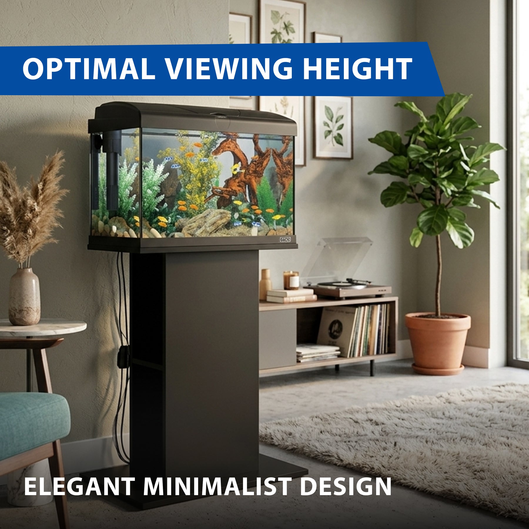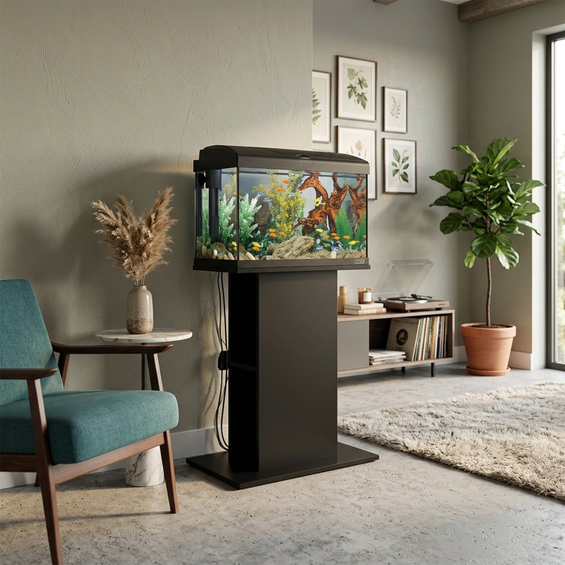 Stand 60 è un mobile per acquari dalle linee essenziali, adatto anche per tartarughiere, dotato di pratici piedini regolabili. Robusto, ha una solida base di appoggio e una finitura colore nero. Il piano superiore, se bagnato e prontamente asciugato, si mantiene inalterato nel tempo e resiste a sporadiche gocce d'acqua.