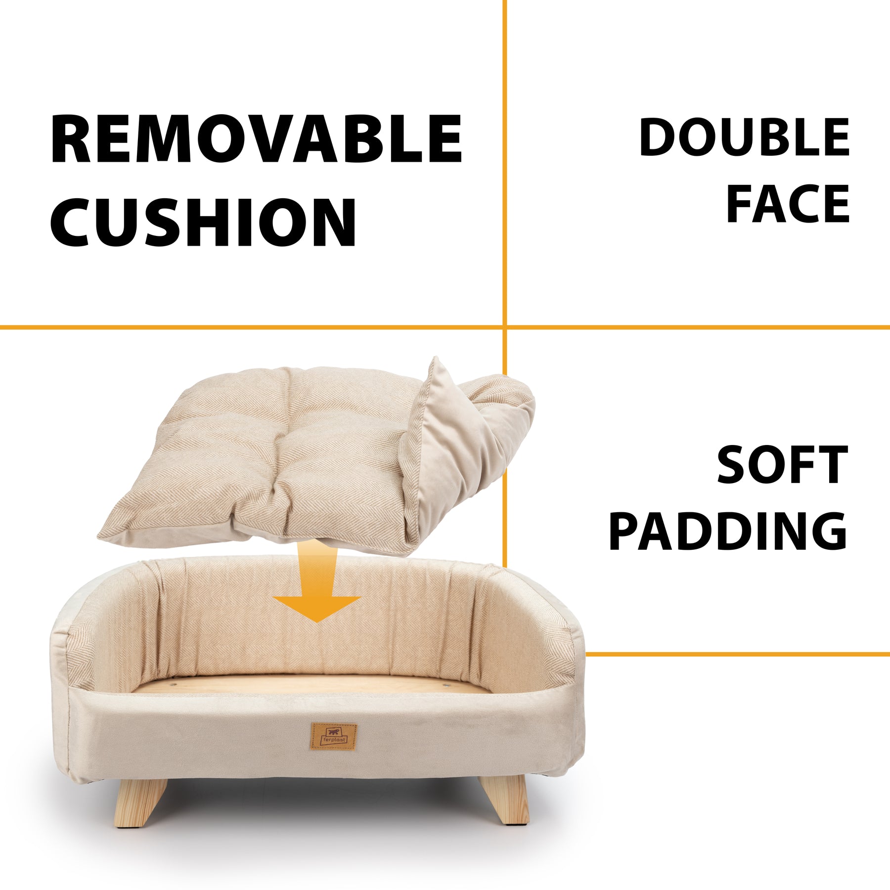 Il cuscino rimovibile è realizzato in morbido tessuto tweed con raffinati dettagli in velluto tono su tono, che donano una sensazione di morbidezza e qualità. L’imbottitura offre un sostegno piacevole durante il riposo e può essere lavata a bassa temperatura (30°C), così da garantire igiene e facilità di manutenzione.
